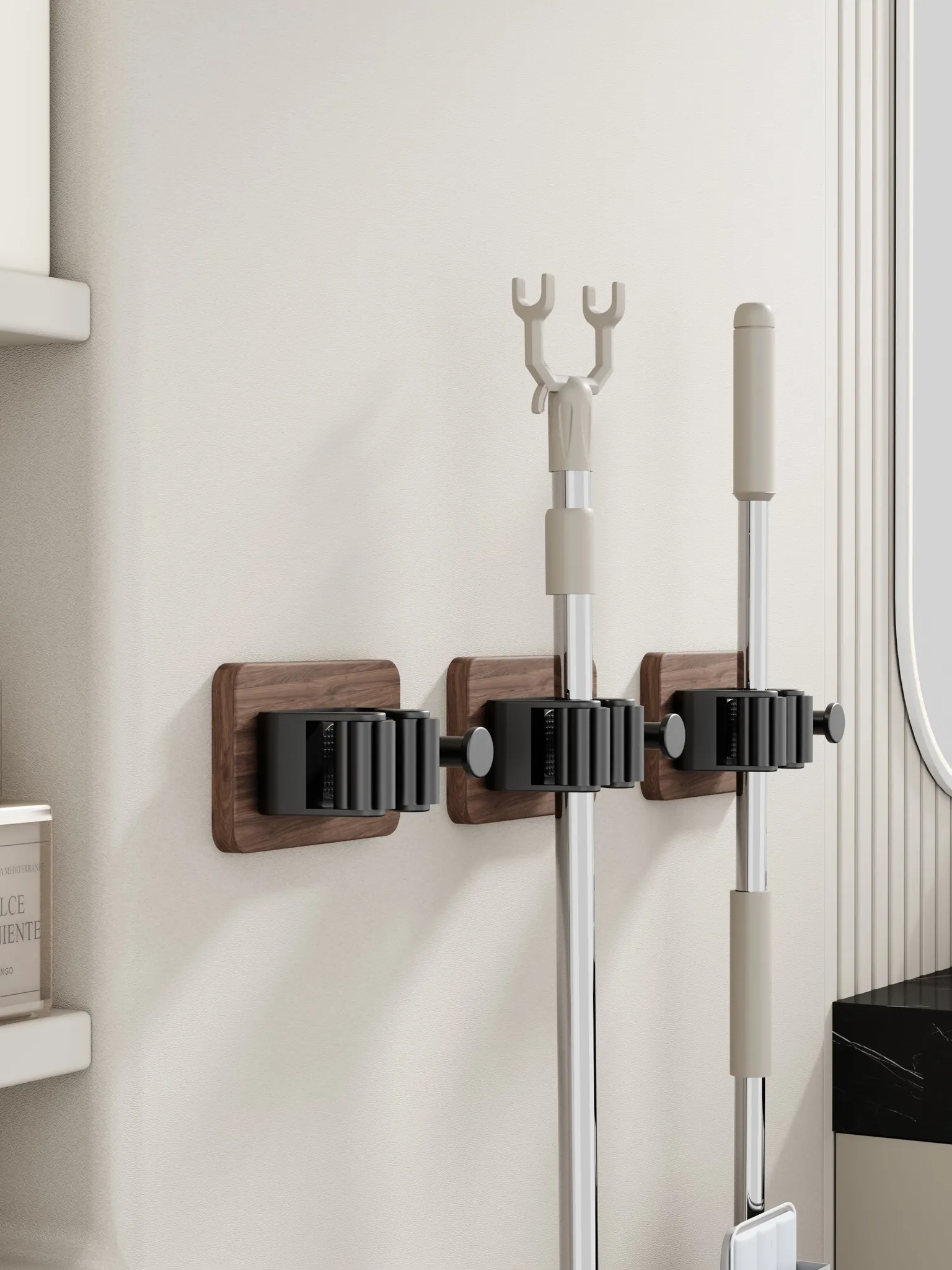 Walnut Wood Mop Wall-Mounted Clip - No Drill Mop Holder for Bathroom, Convenient Storage for Mops and Brooms, Keeps Your Space Organized and Tidy
