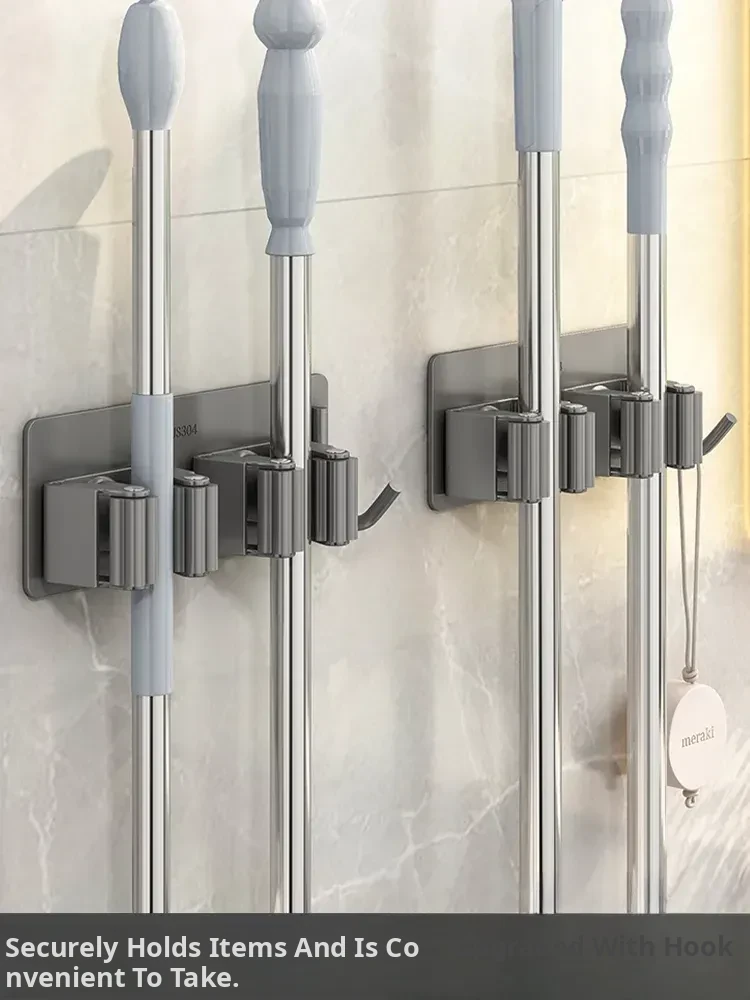Wall-Mounted Mop Holder with Hooks - No Drill Bathroom Storage Solution for Mops, Brooms, and Cleaning Cloths - Space-Saving Organizer for a Tidy Bathroom