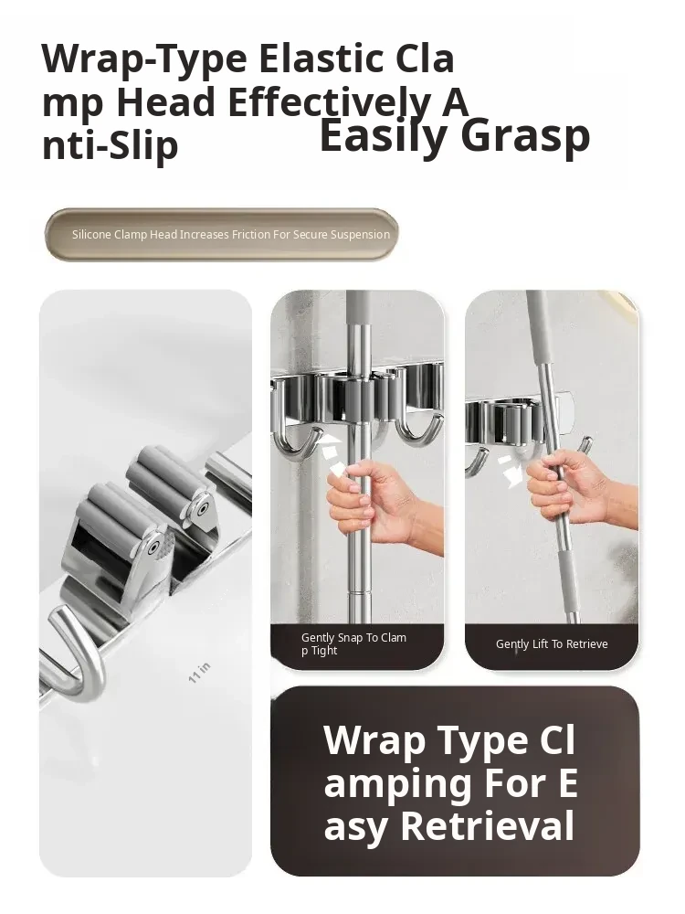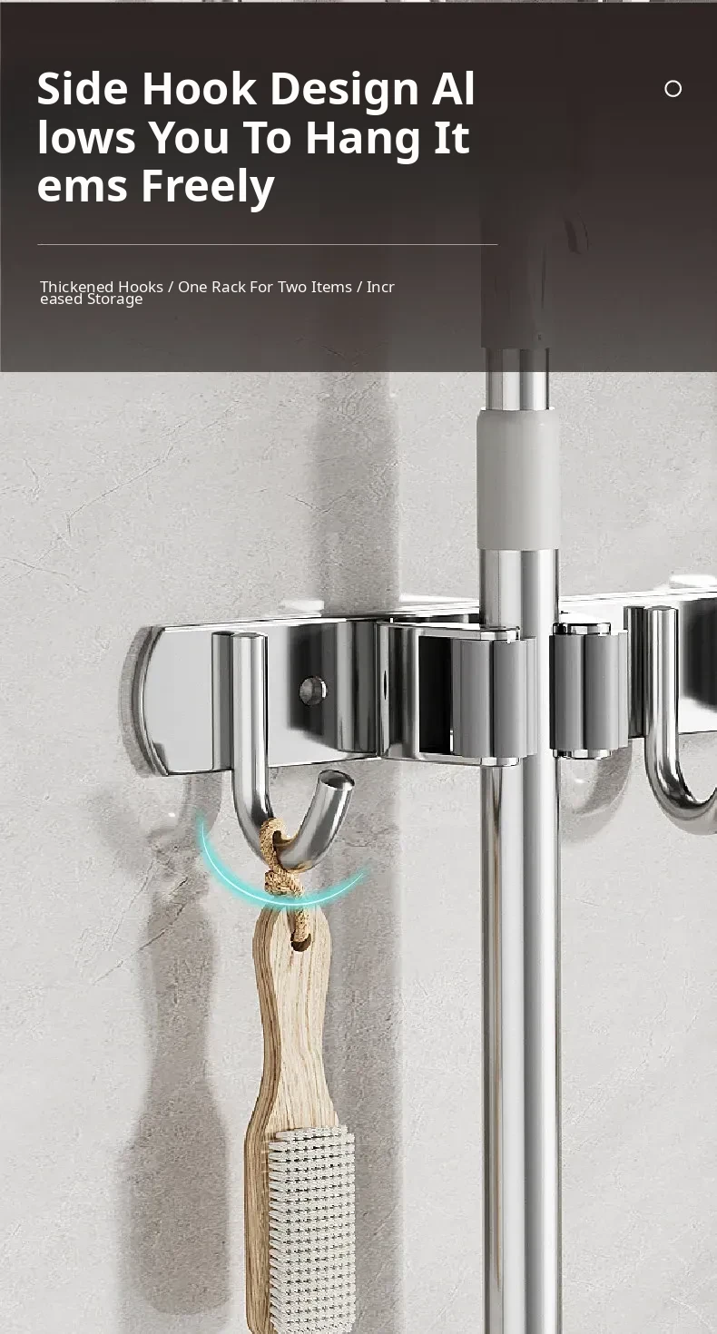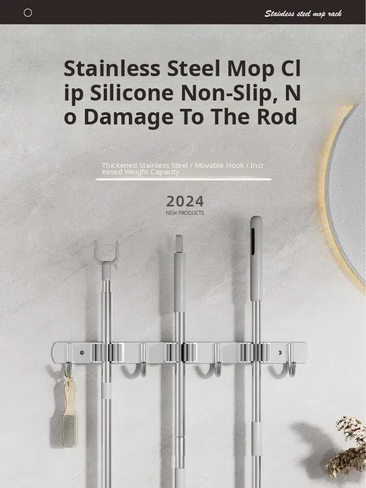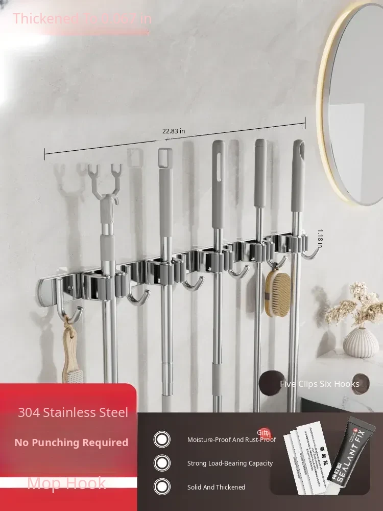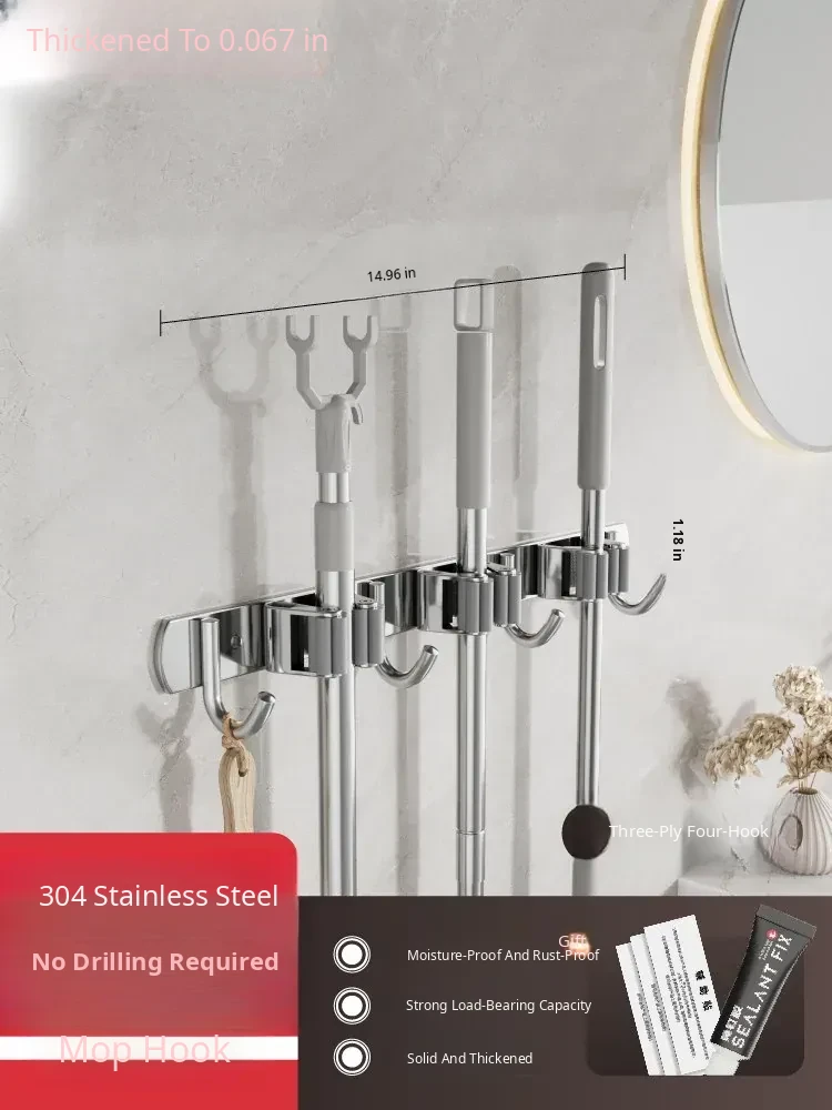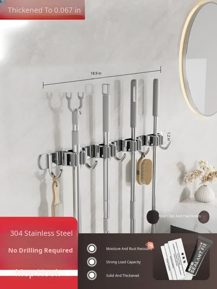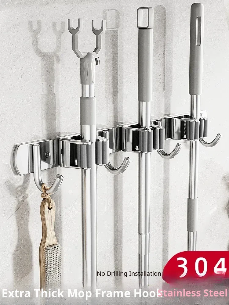 304 Stainless Steel Mop Wall-Mounted Holder - No Drill Hook for Mops and Brooms, Heavy-Duty Bathroom Organizer, Space-Saving Cleaning Tool, Rust-Proof Design
