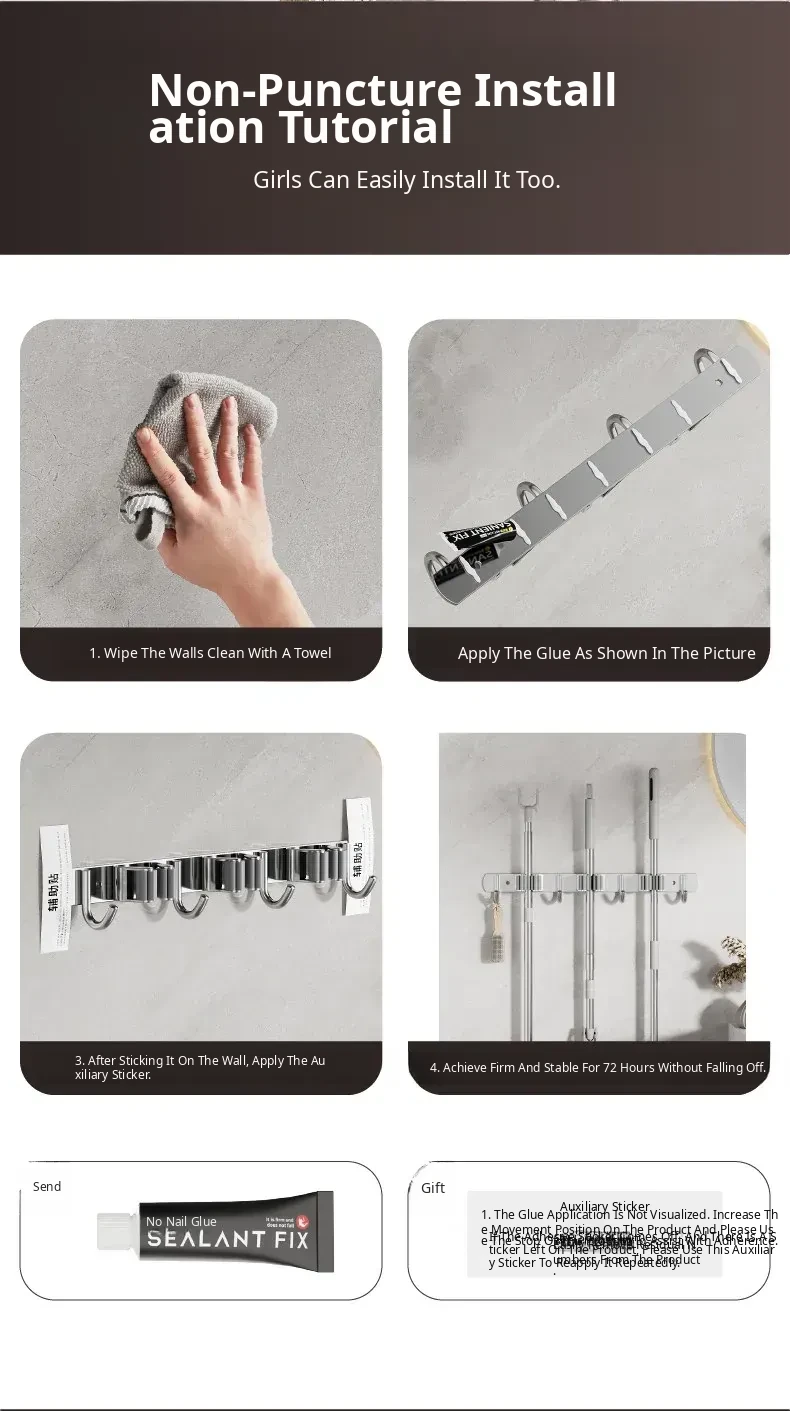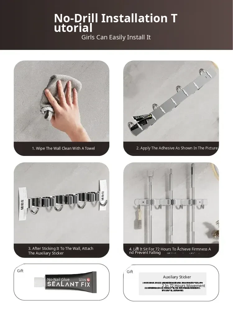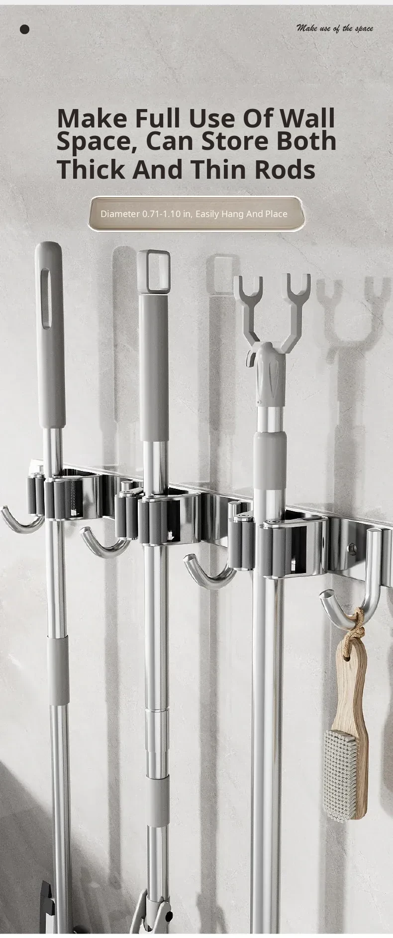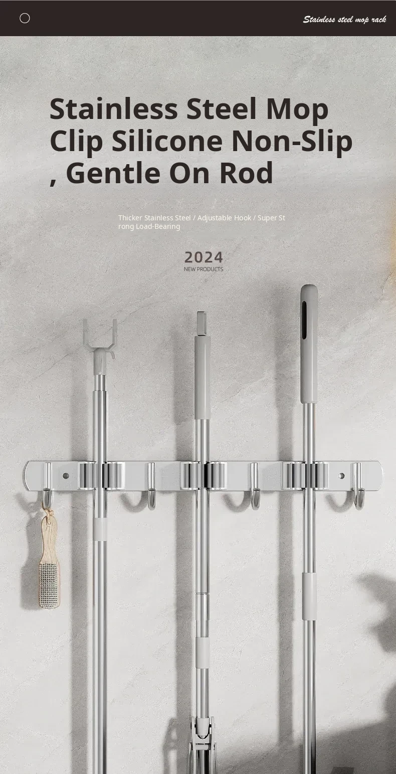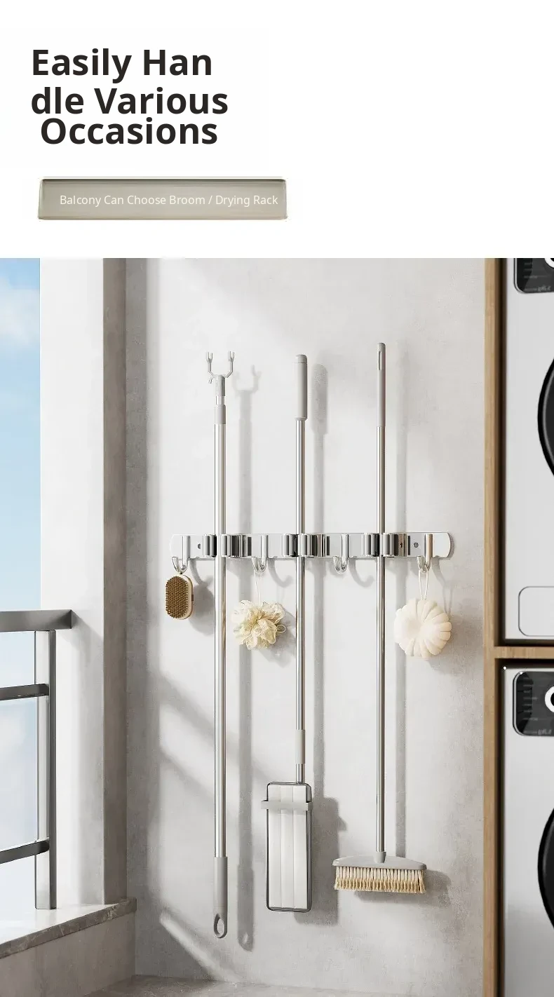 304 Stainless Steel Mop Wall-Mounted Holder - No Drill Hook for Mops and Brooms, Heavy-Duty Bathroom Organizer, Space-Saving Cleaning Tool, Rust-Proof Design