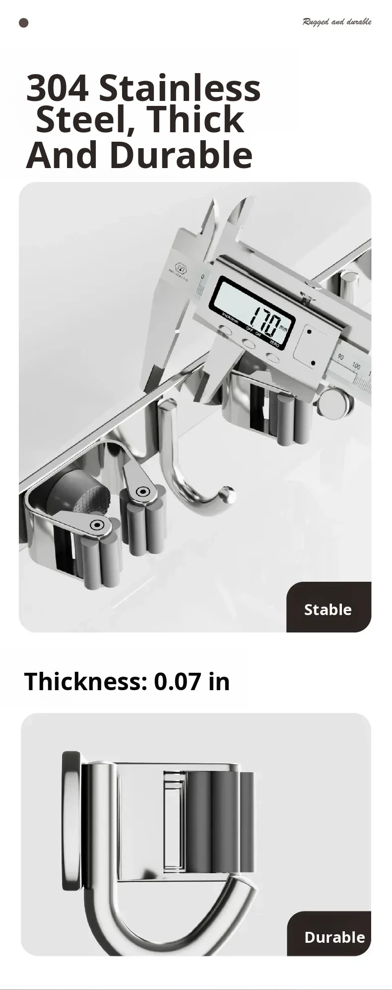 304 Stainless Steel Extra Thick Mop and Broom Holder with 3 Clips, 4 Hooks, Solid Core, Heavy-Duty Load Bearing