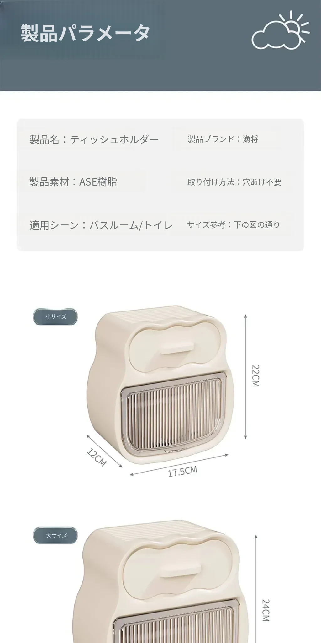 【掛けられるトイレットペーパー&ティッシュ】クリームブルー - 小サイズ