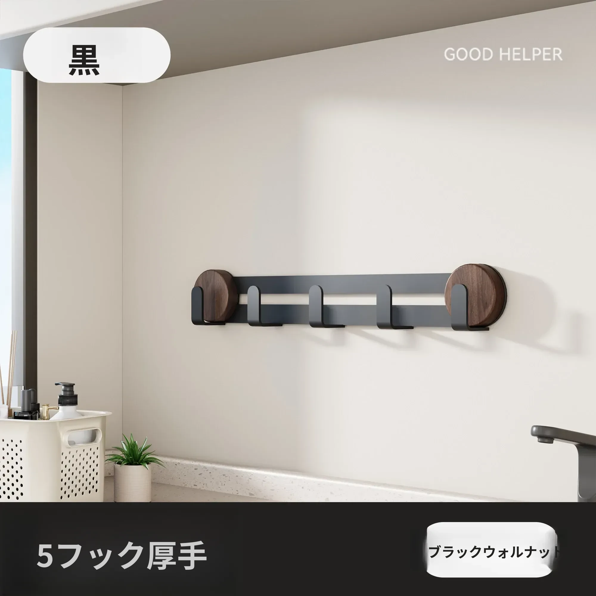 ブラック - ウォールナット【吸盤フック5フック】