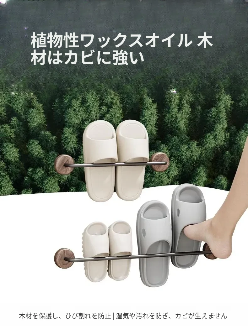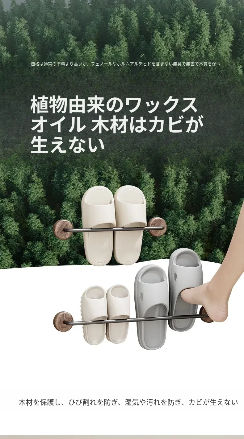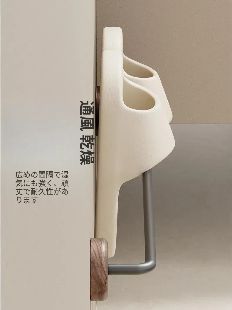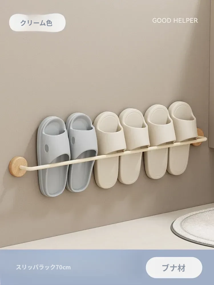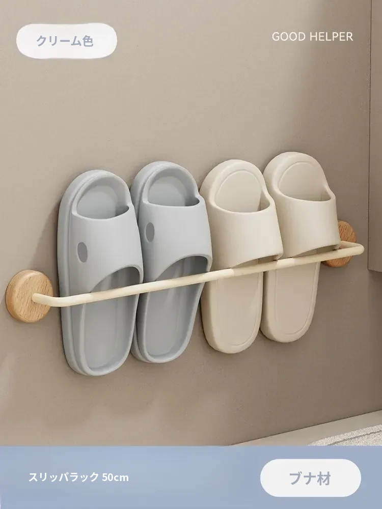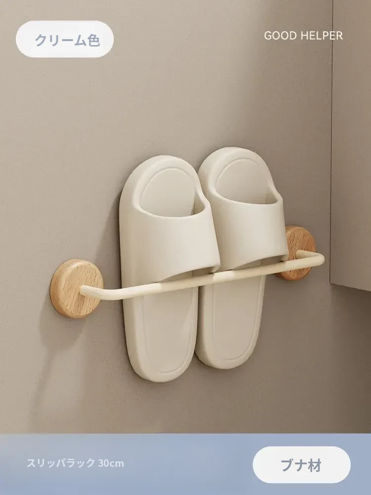 クリーム風の天然木製バスルームスリッパラック - 穴を開けずに簡単取り付け!衛生的な収納で、玄関やバスルームのスペースを有効活用。水切り機能付きで、靴を清潔に保つ便利アイテム!