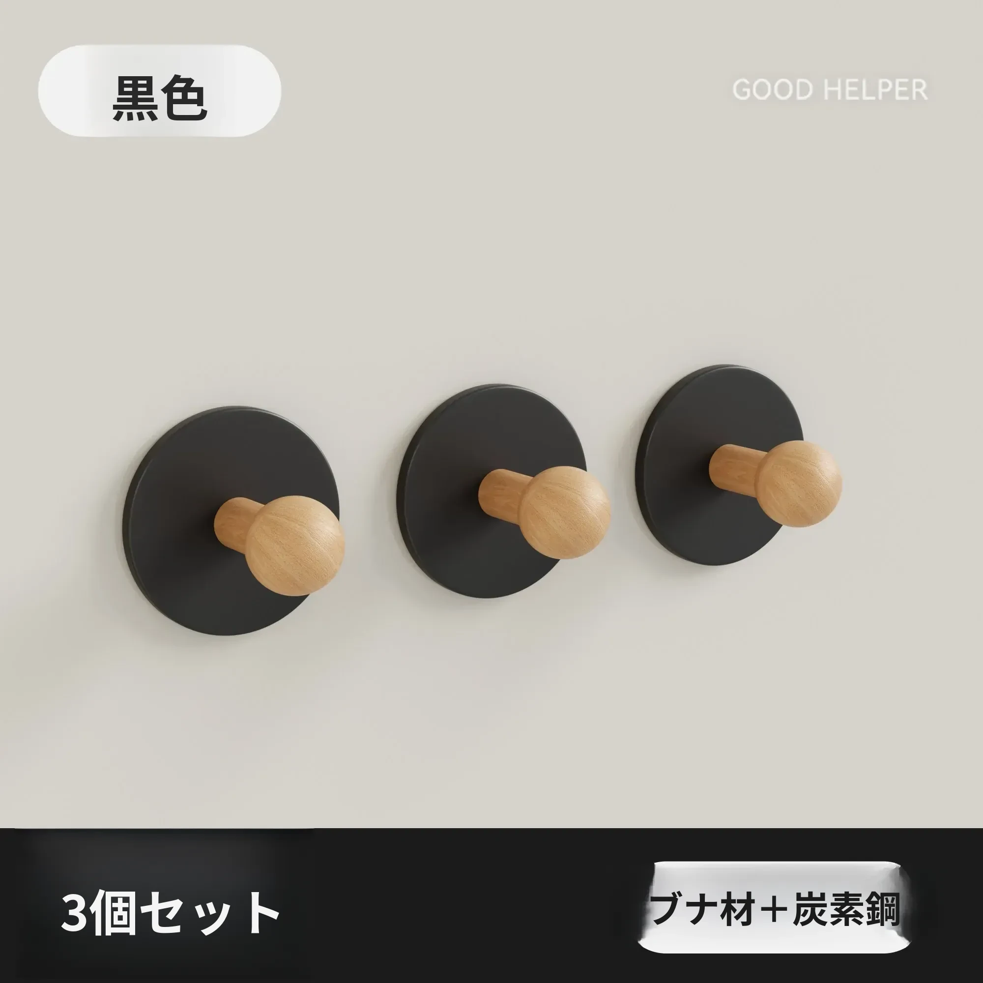 ブナ材カーボンスチール【黒色3個入り】穴あけ不要