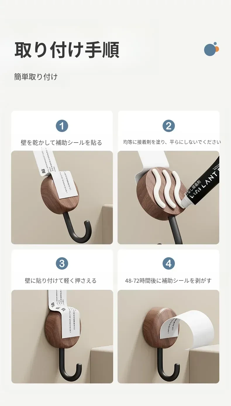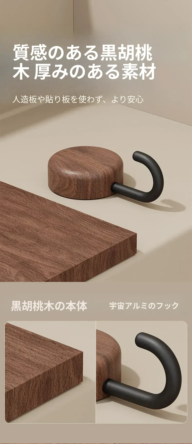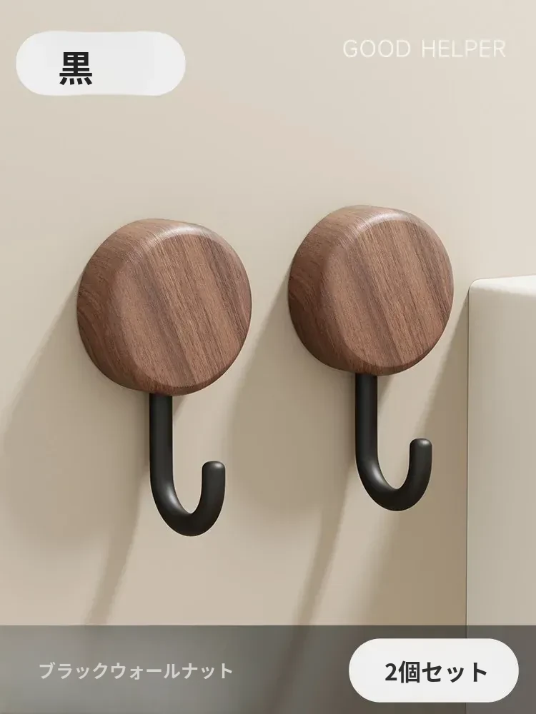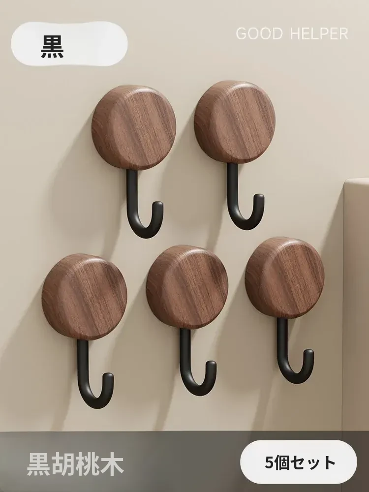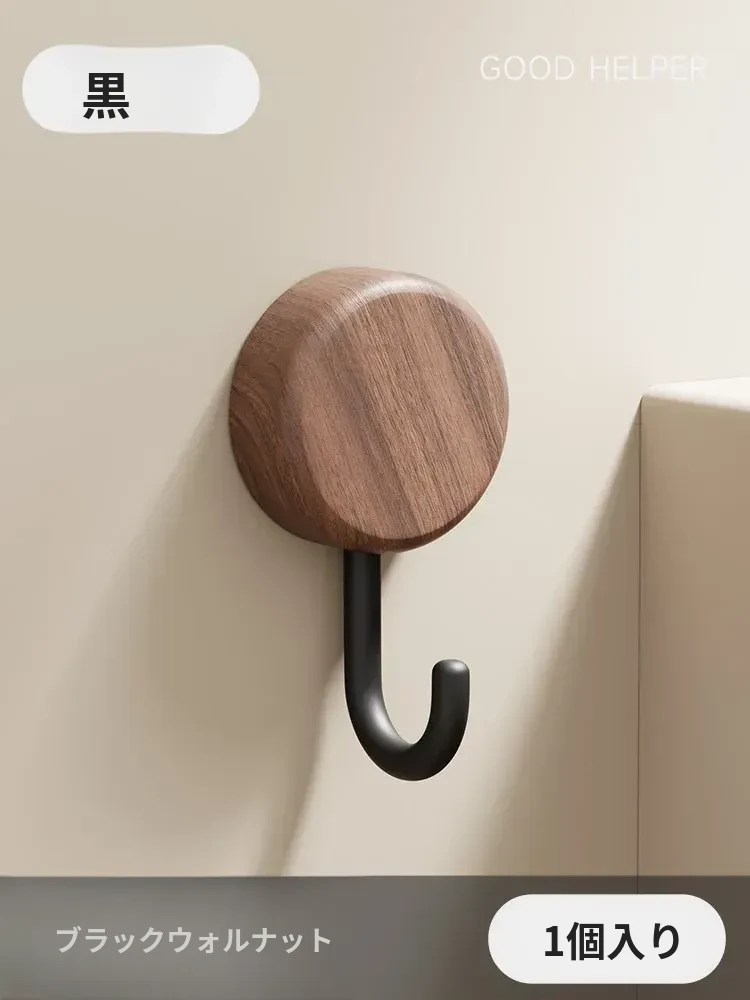高級感あふれるウォールナット製ハンガーフック - 強力粘着で取り付け簡単!バスルームやキッチンに最適、鍵や衣類をしっかりと支えます。ネジ不要で手軽におしゃれな収納を実現!