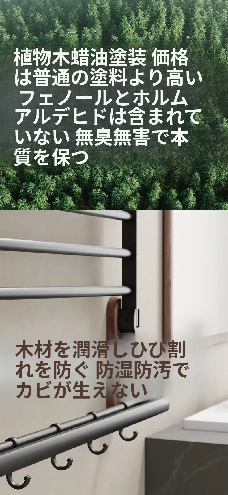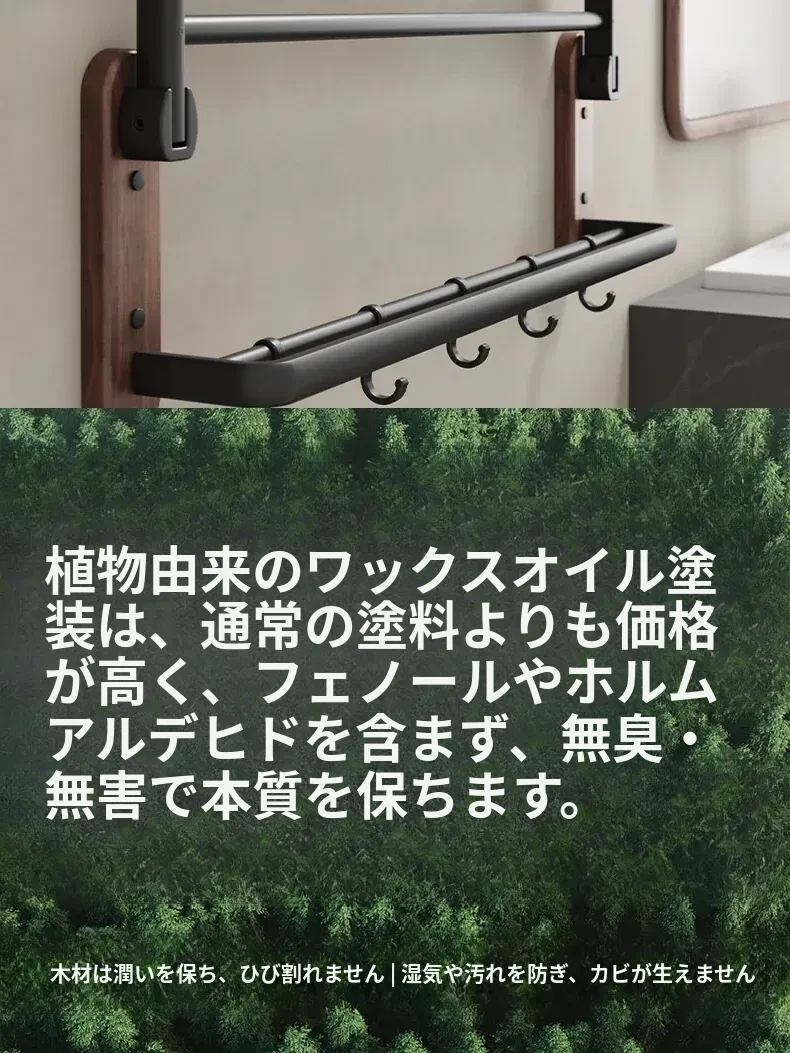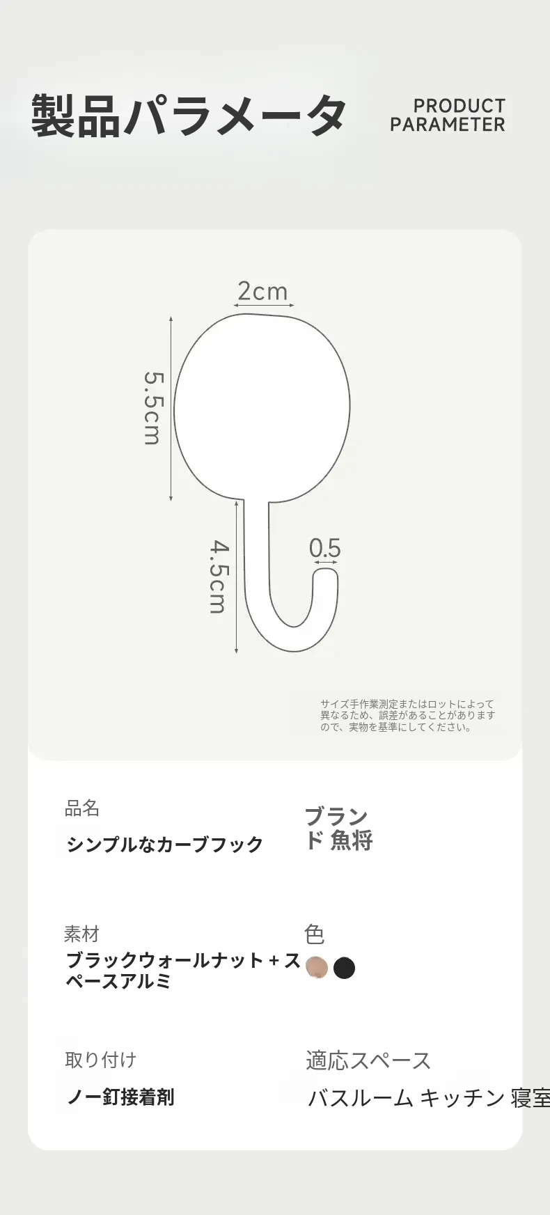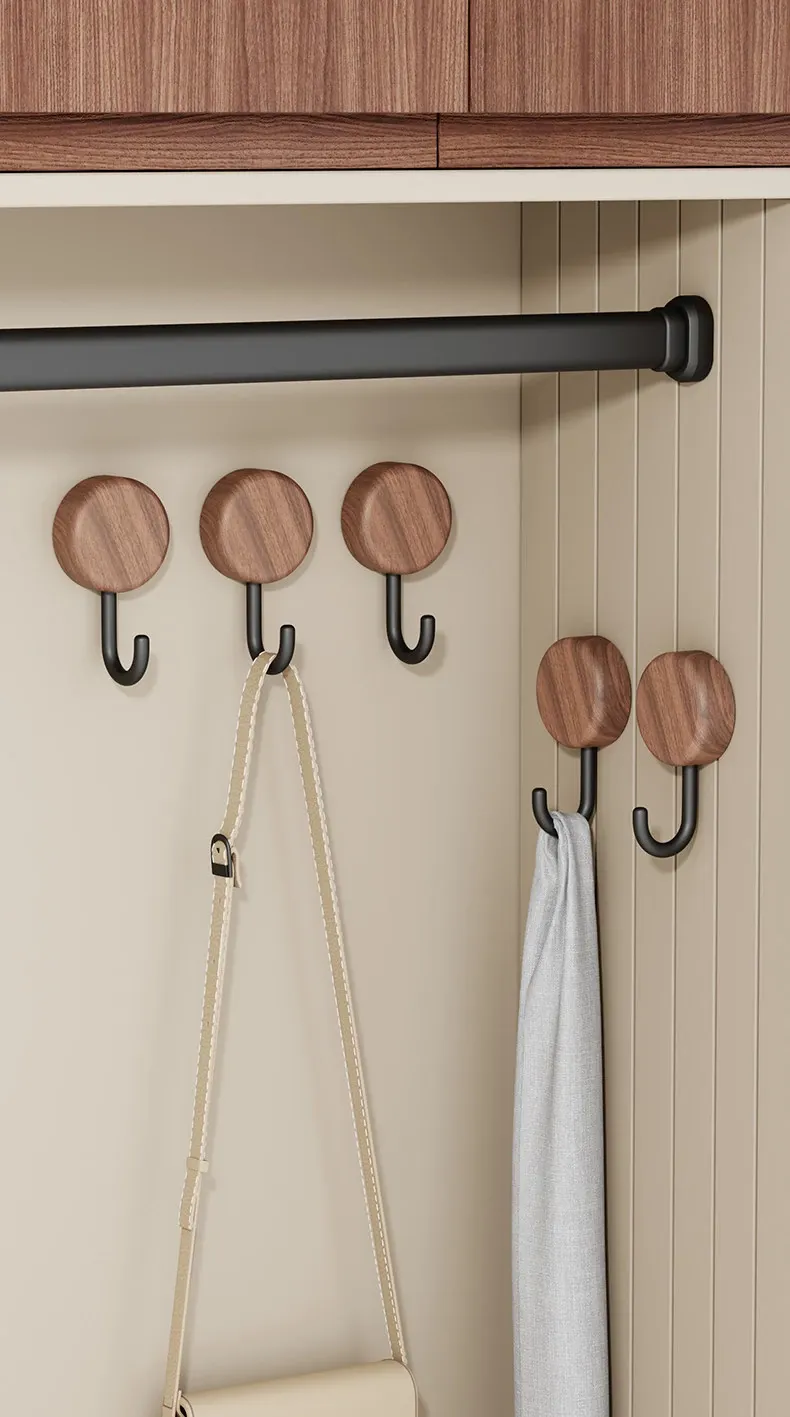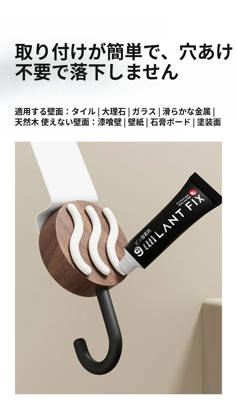 高級感あふれるウォールナット製ハンガーフック - 強力粘着で取り付け簡単!バスルームやキッチンに最適、鍵や衣類をしっかりと支えます。ネジ不要で手軽におしゃれな収納を実現!