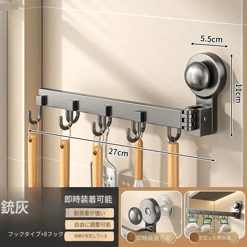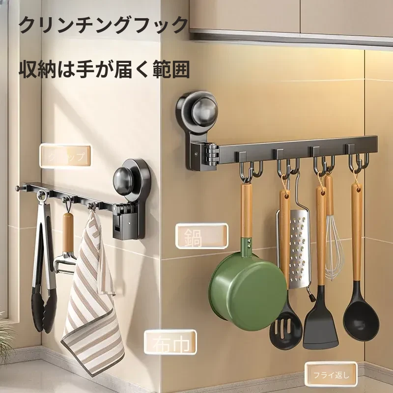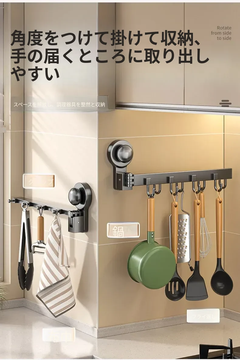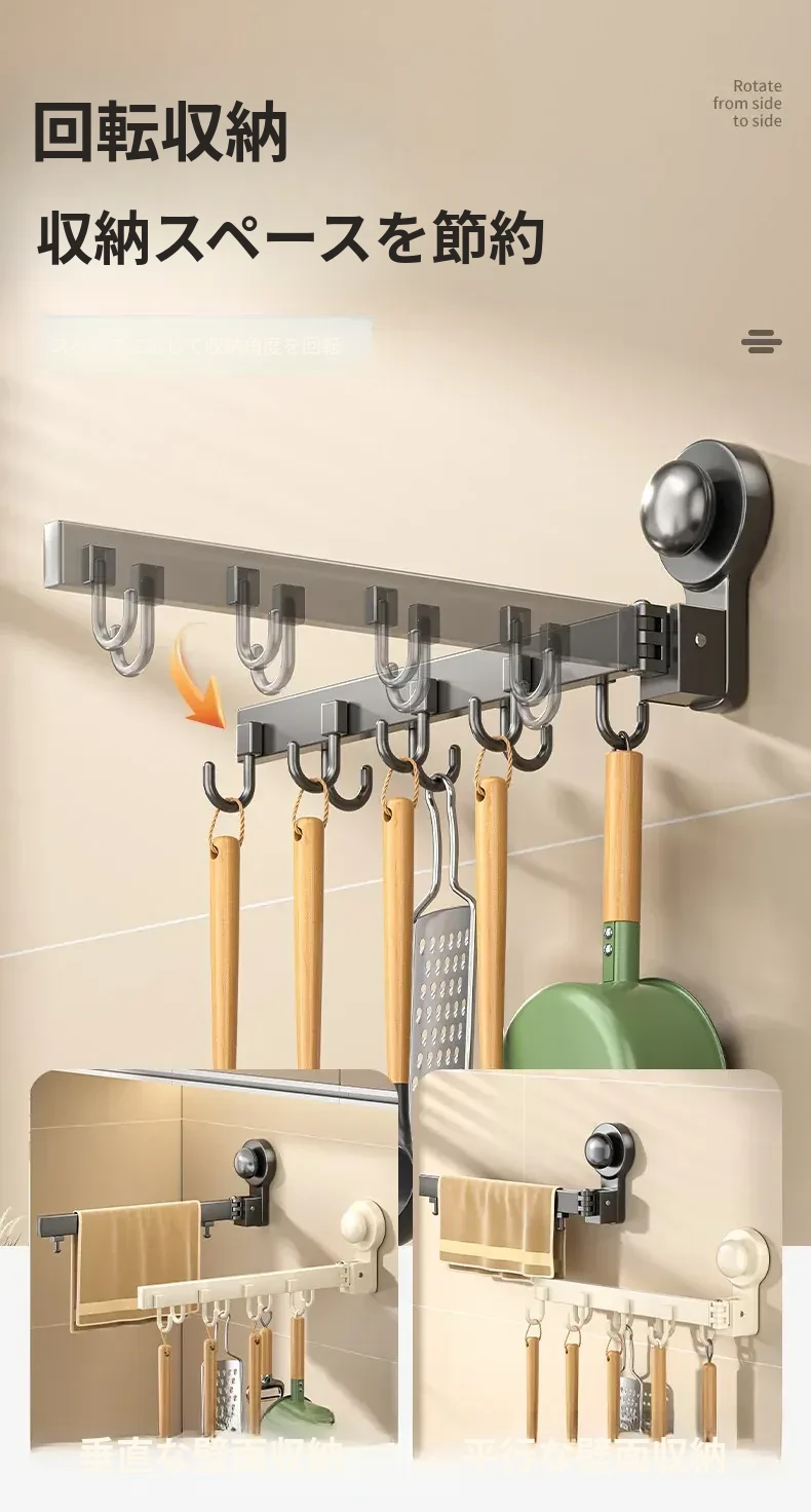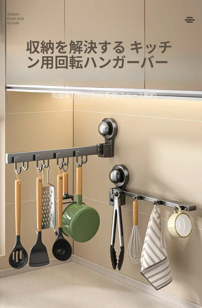 回転式サクションキッチンフック - 多機能ハンガーバー収納ラック、回転式クロスホルダー&スプーン・フライ返し掛け、キッチンをスッキリ整理!