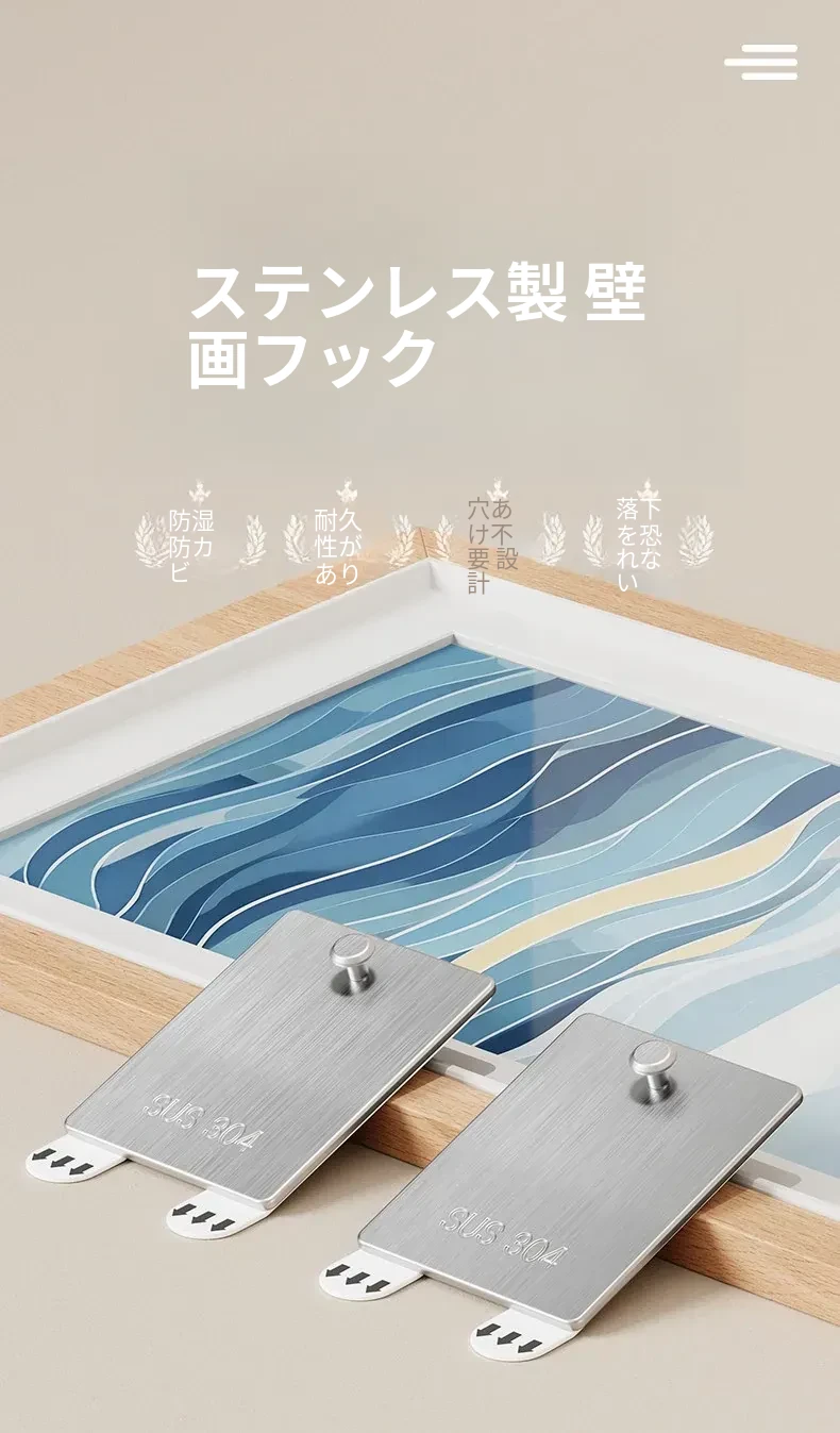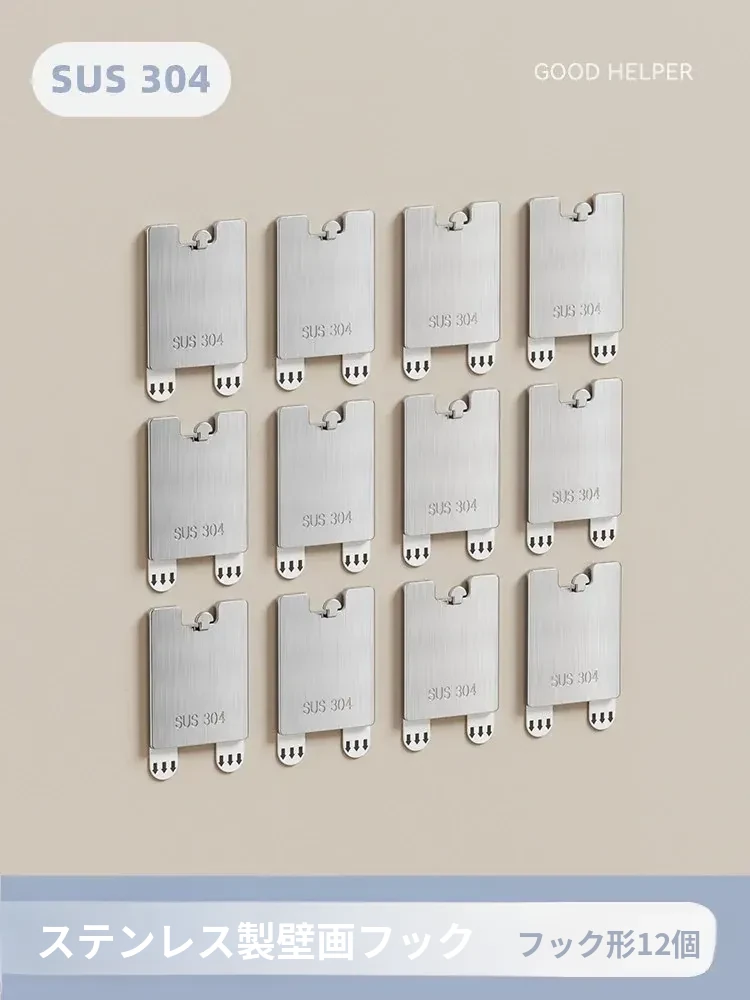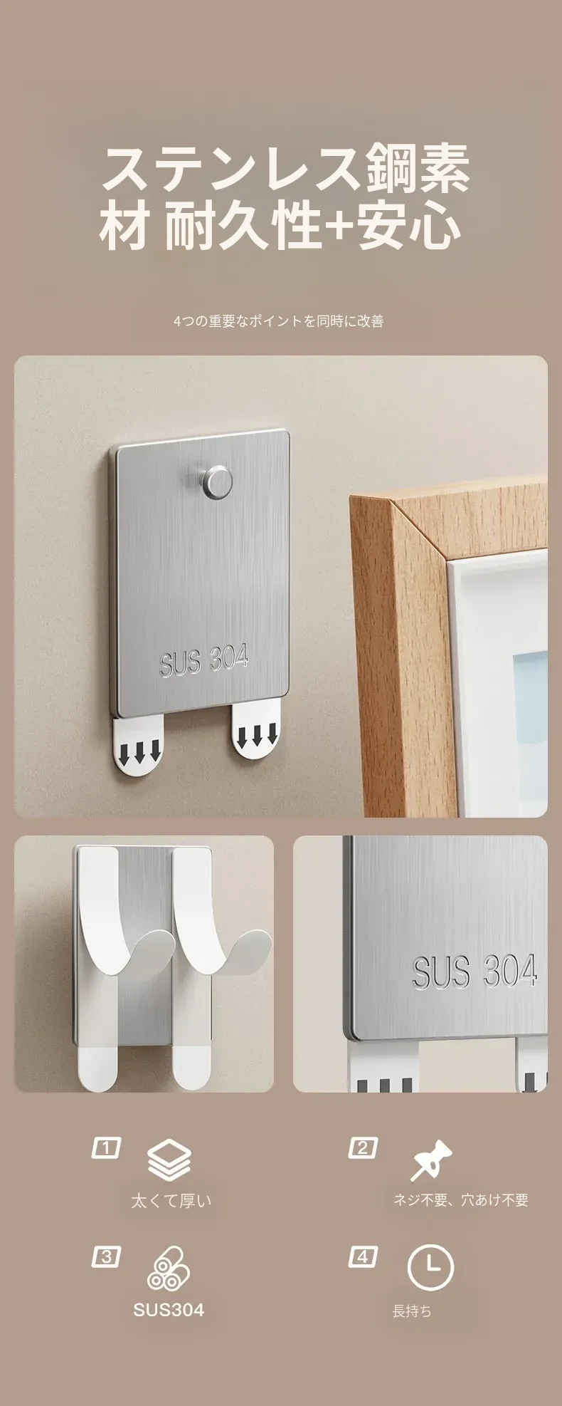 壁掛けアートの必需品!穴を開けずに簡単取り付け、無痕で美しい仕上がり。ステンレス製のフレームフックで、あなたの大切なアートをしっかり固定。おしゃれなインテリアを手軽に実現しましょう!