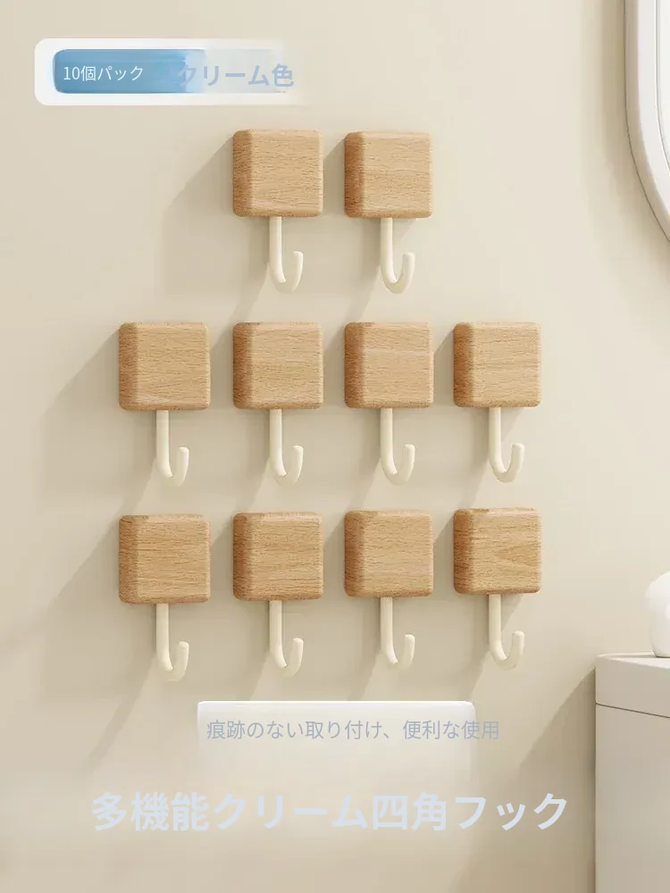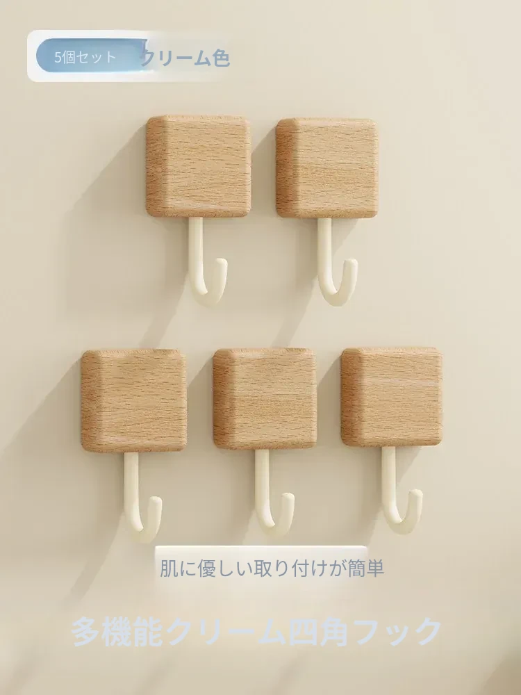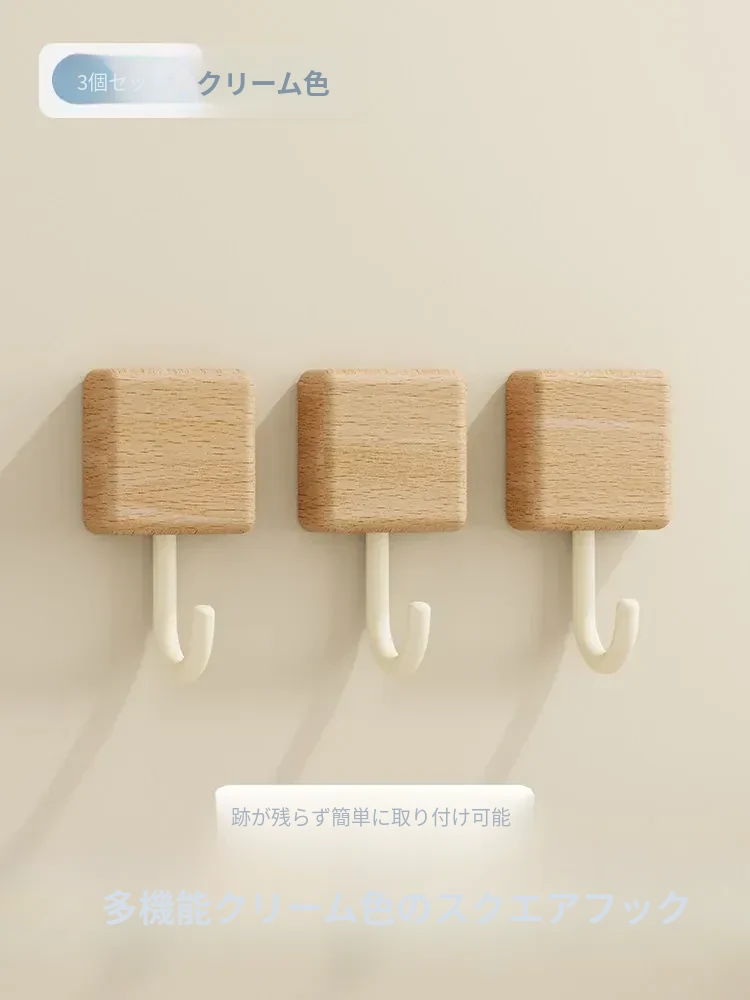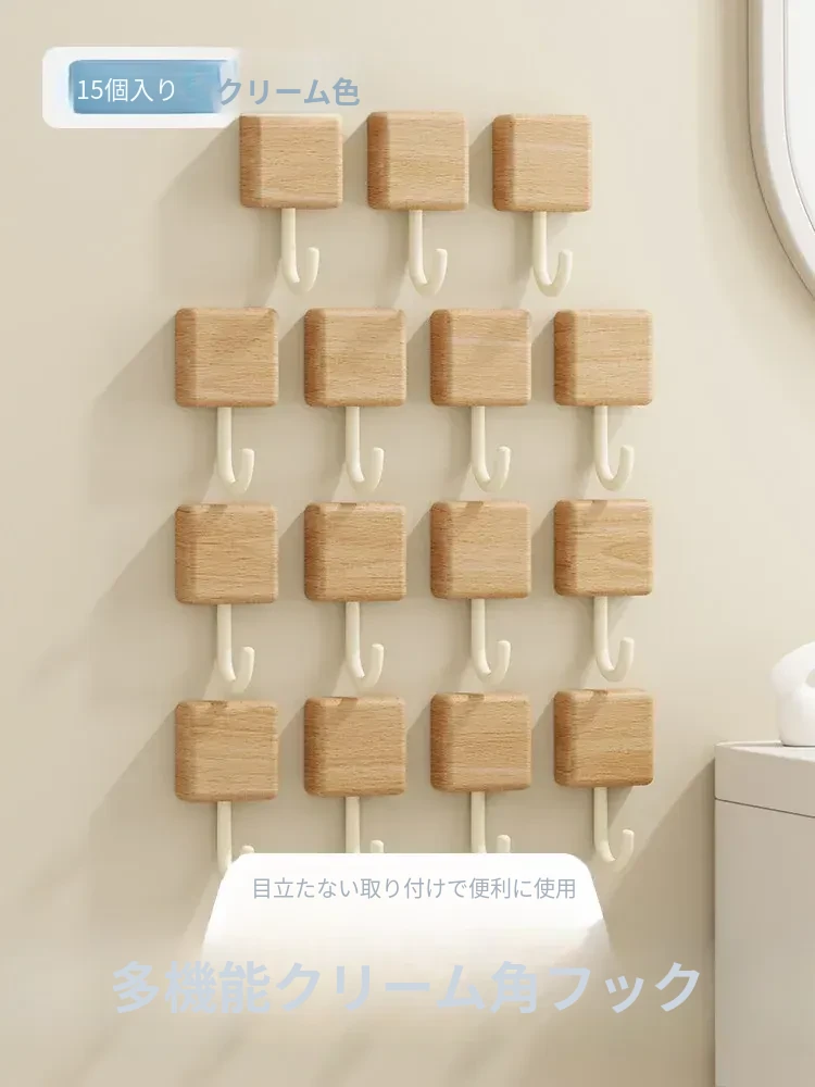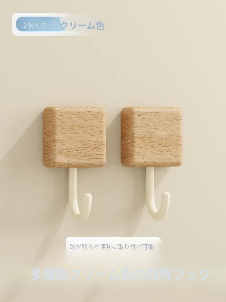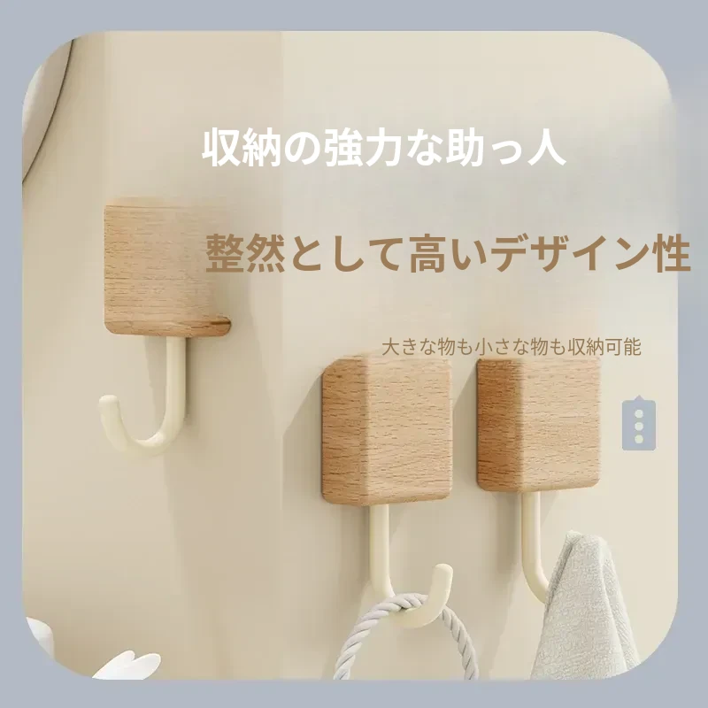 強力粘着フック - 木製の壁掛けフック、キッチンやバスルームに最適!衣類や小物をしっかり支える、穴なし取り付けで玄関もスッキリ。おしゃれで実用的な収納アイテム!