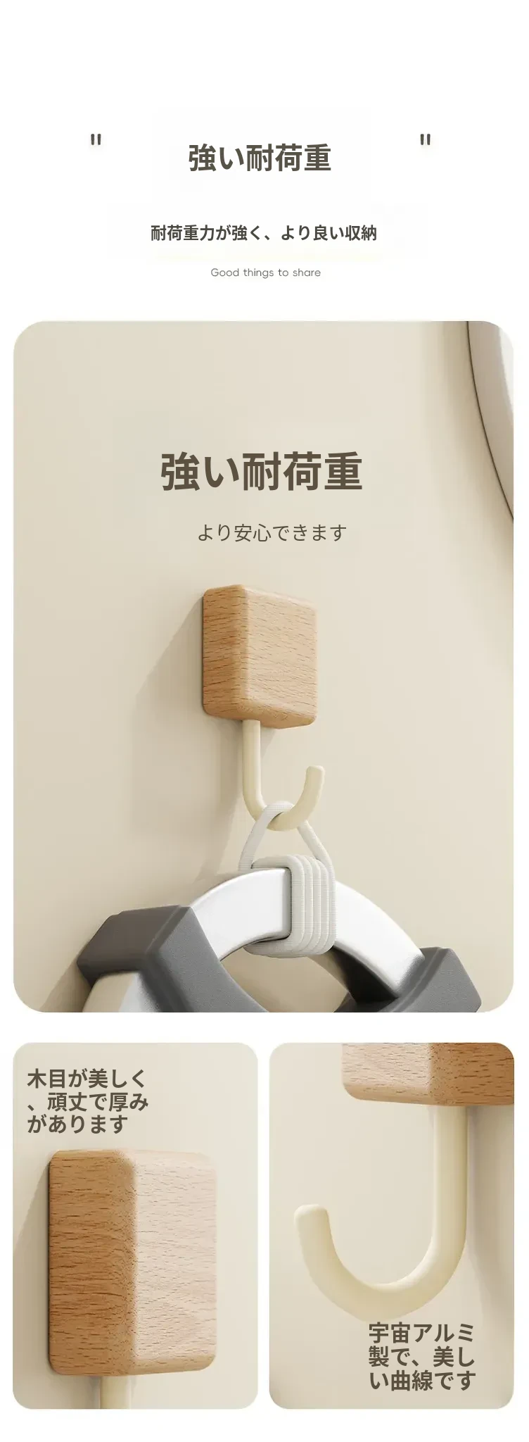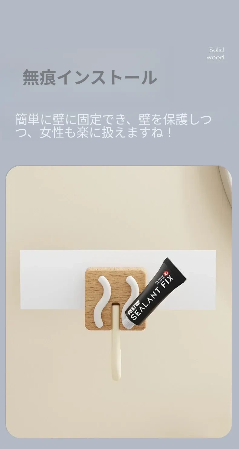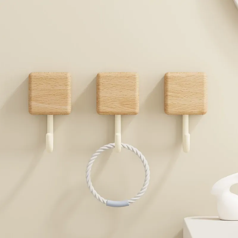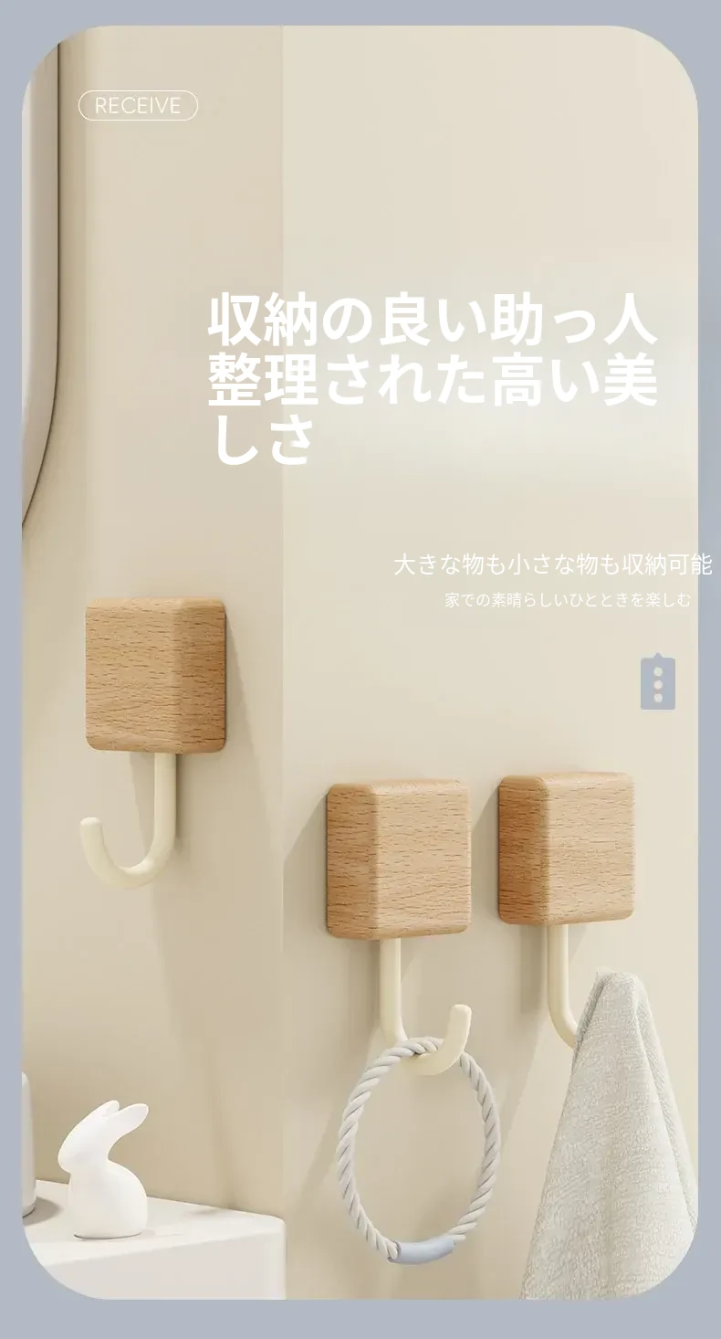 強力粘着フック - 木製の壁掛けフック、キッチンやバスルームに最適!衣類や小物をしっかり支える、穴なし取り付けで玄関もスッキリ。おしゃれで実用的な収納アイテム!