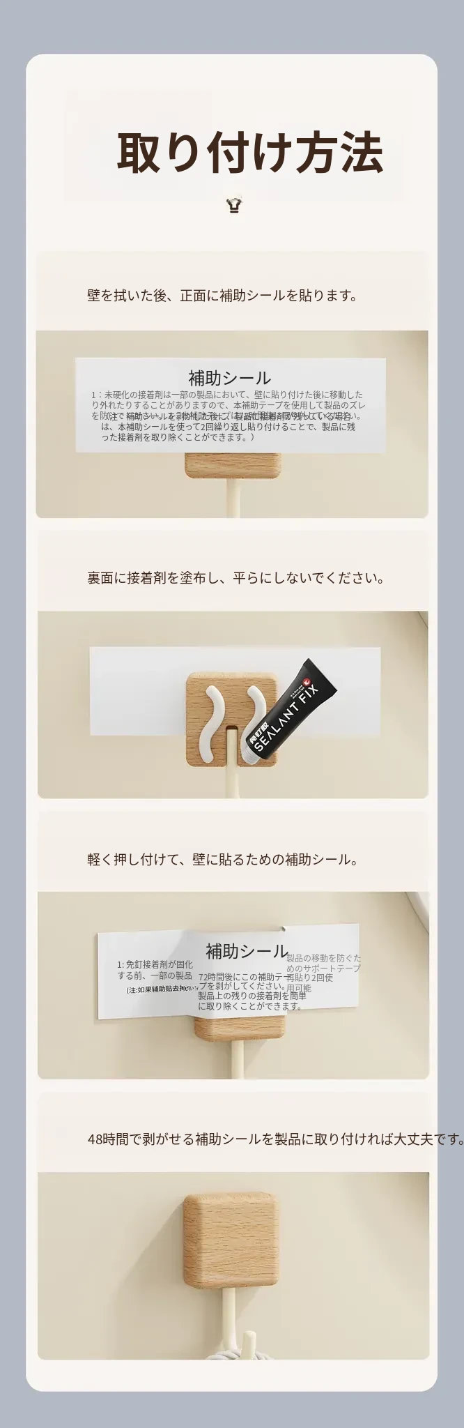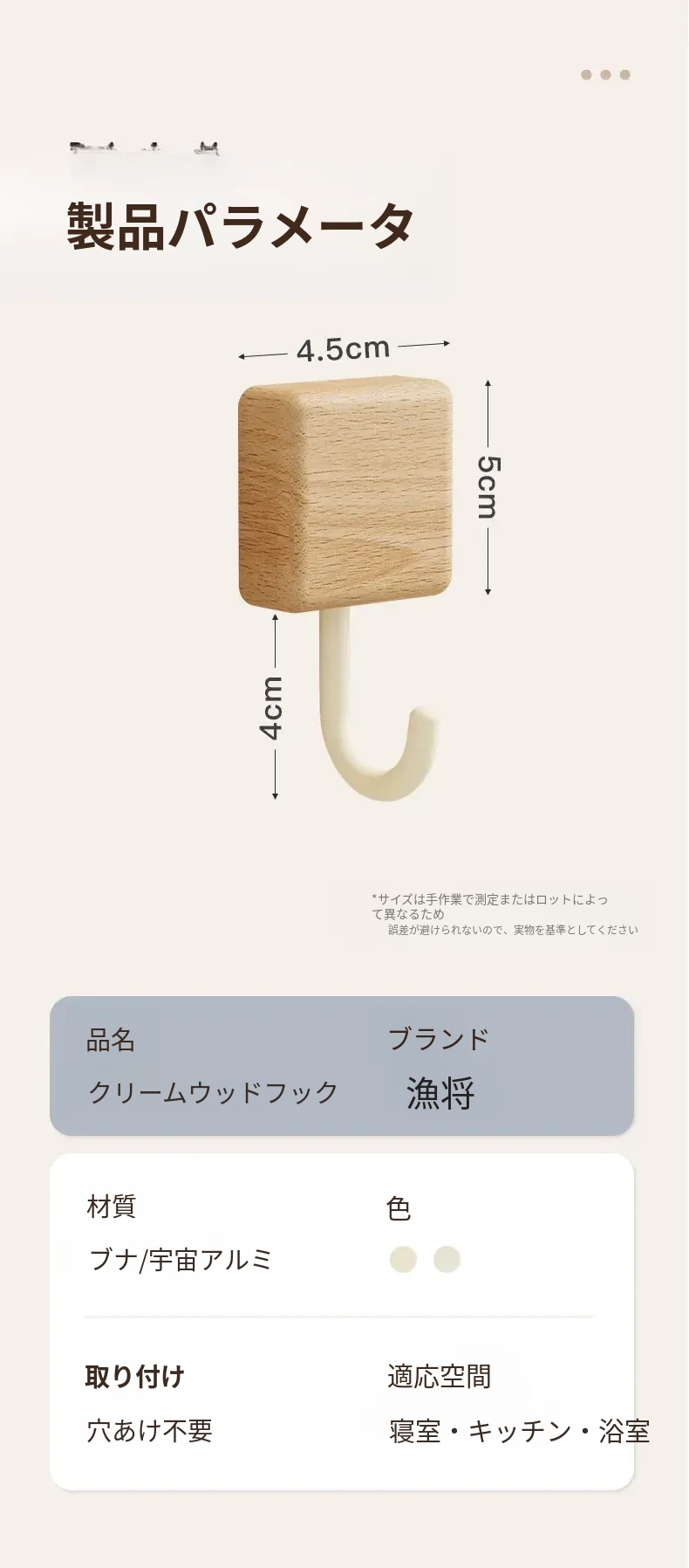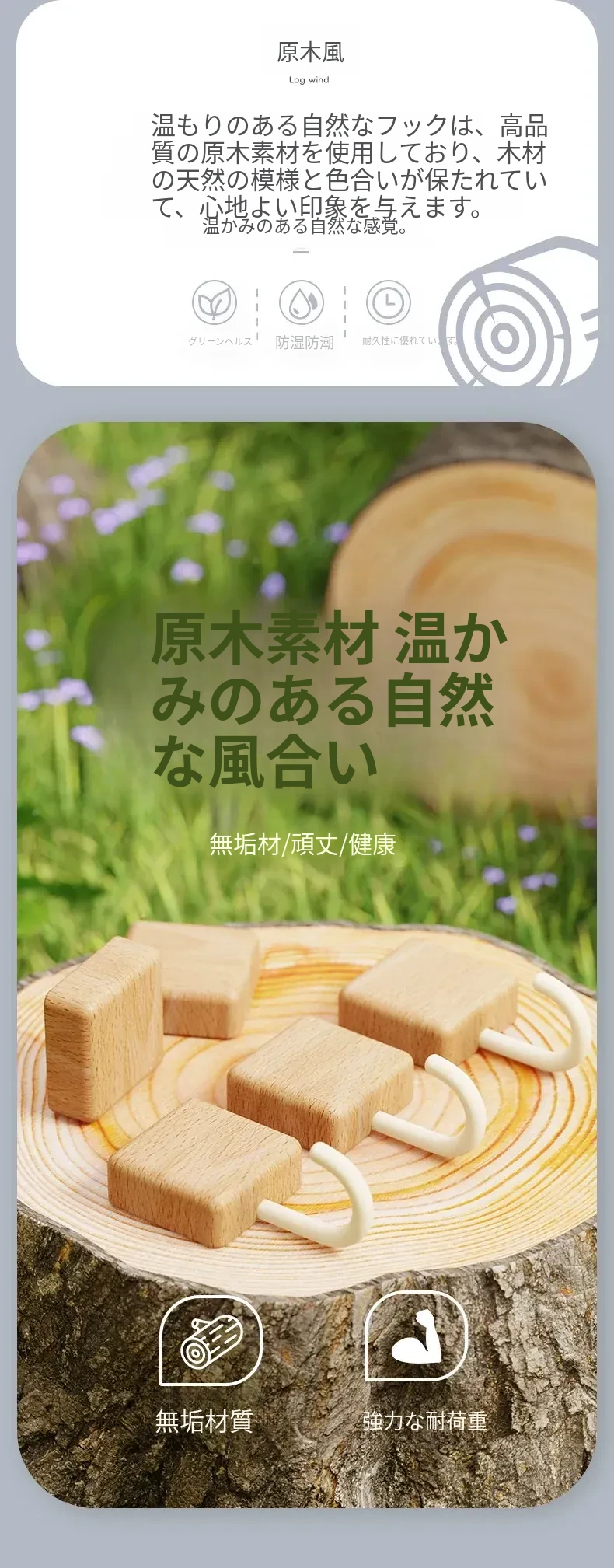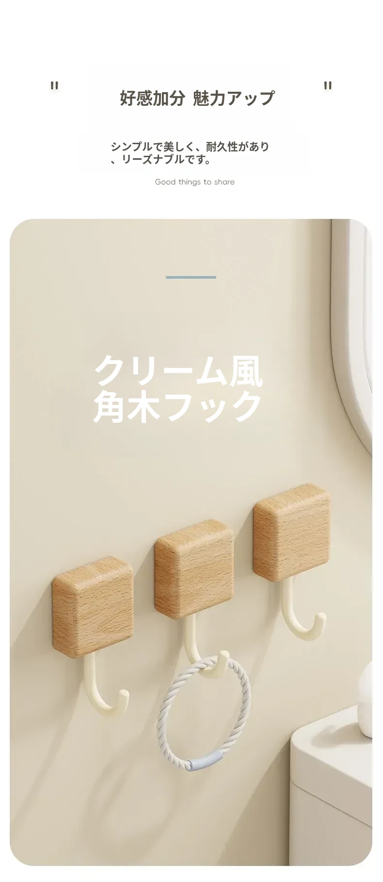 強力粘着フック - 木製の壁掛けフック、キッチンやバスルームに最適!衣類や小物をしっかり支える、穴なし取り付けで玄関もスッキリ。おしゃれで実用的な収納アイテム!