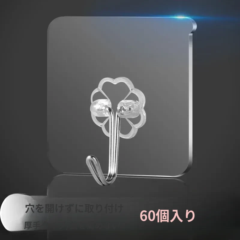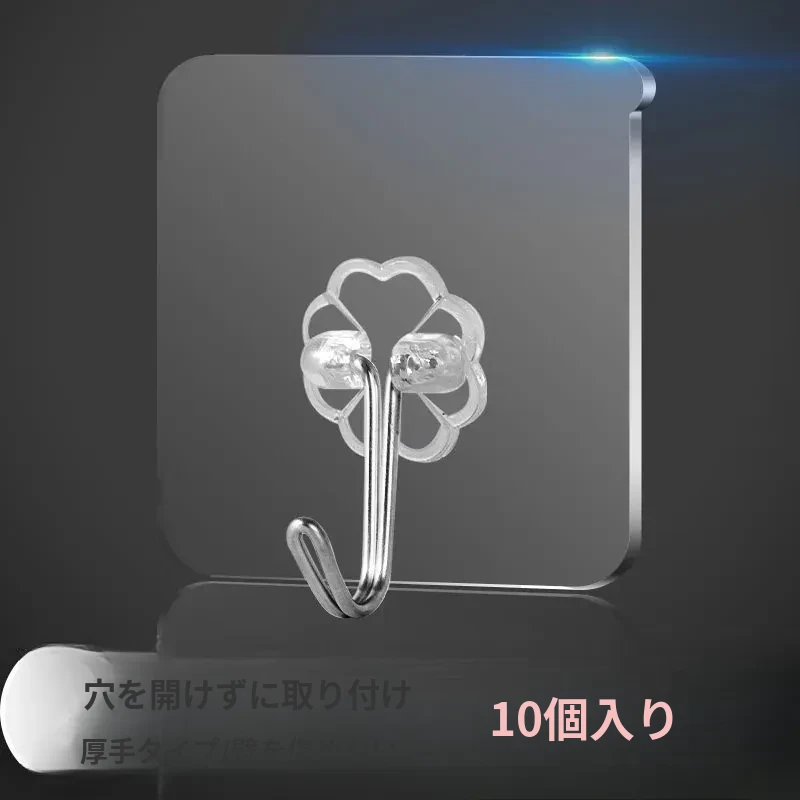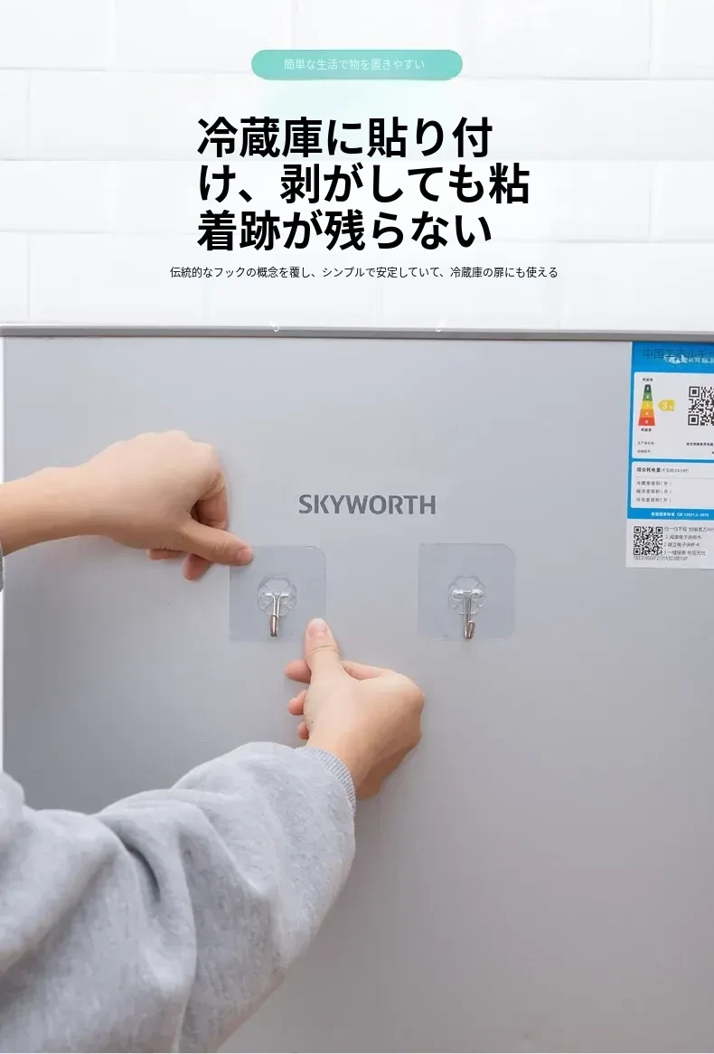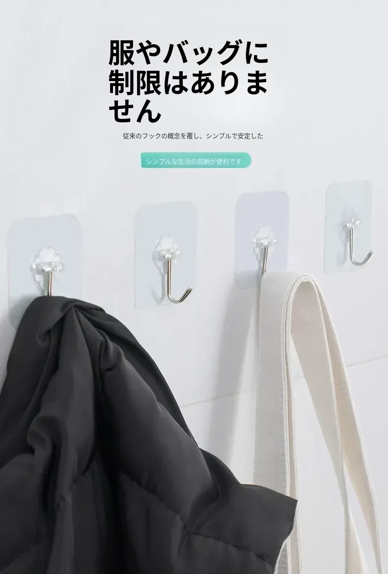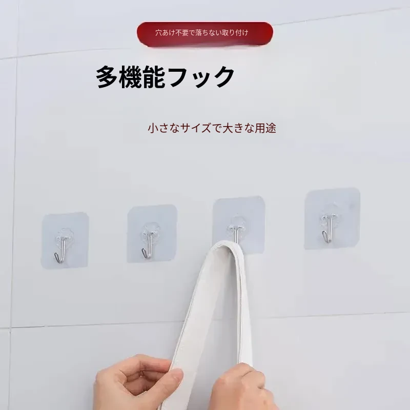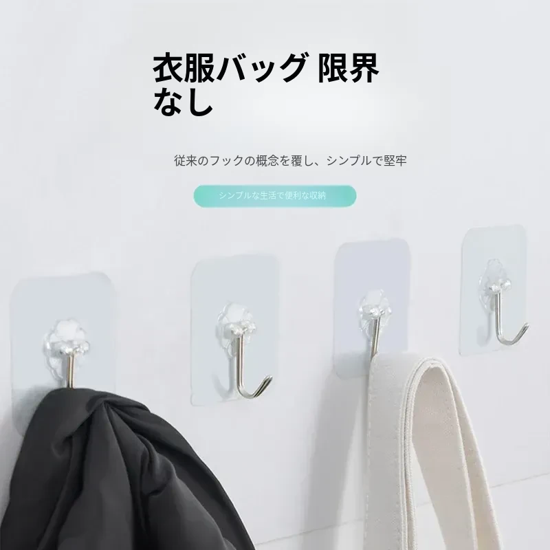 透明フック 強力粘着で穴あけ不要!壁に傷をつけず、超強力でしっかり支える小型フック。家庭用に最適な無痕粘着フックで、整理整頓も簡単!