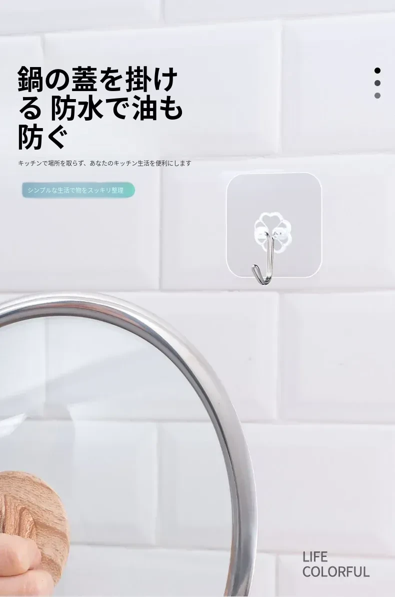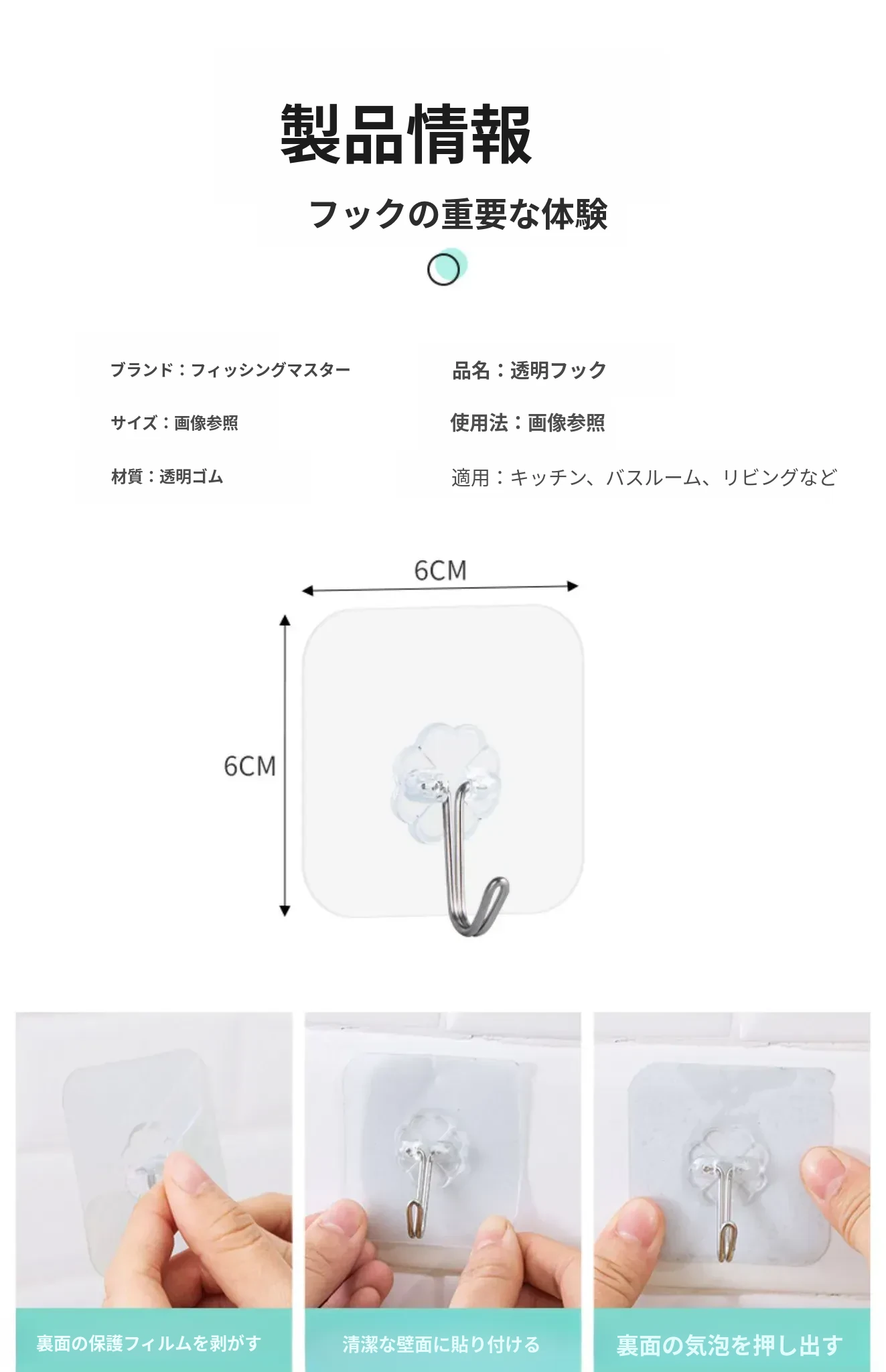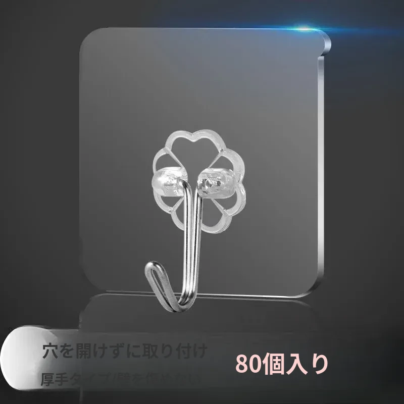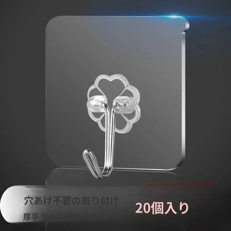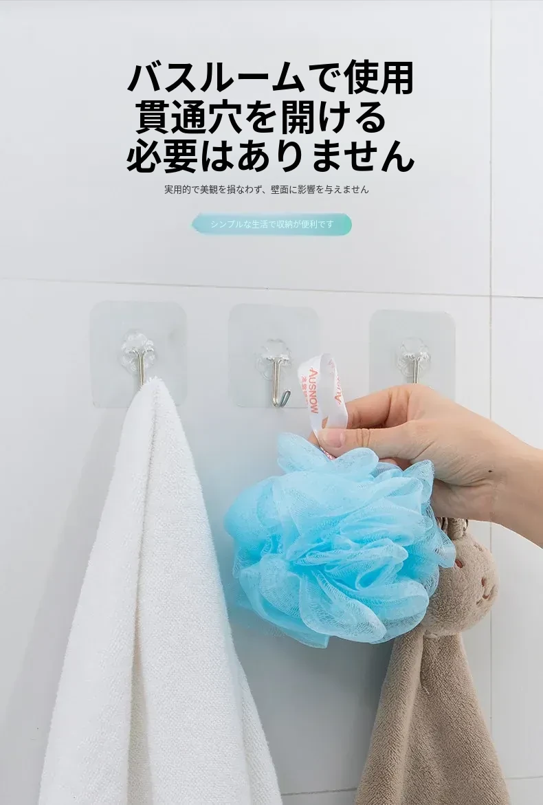 透明フック 強力粘着で穴あけ不要!壁に傷をつけず、超強力でしっかり支える小型フック。家庭用に最適な無痕粘着フックで、整理整頓も簡単!