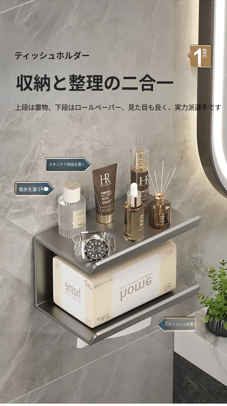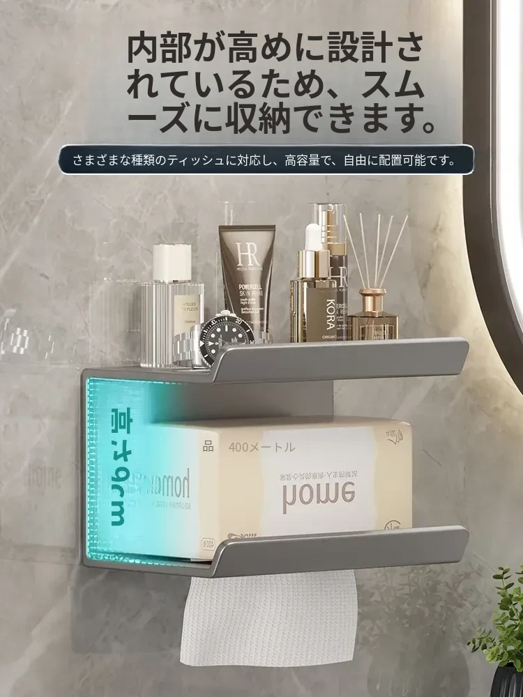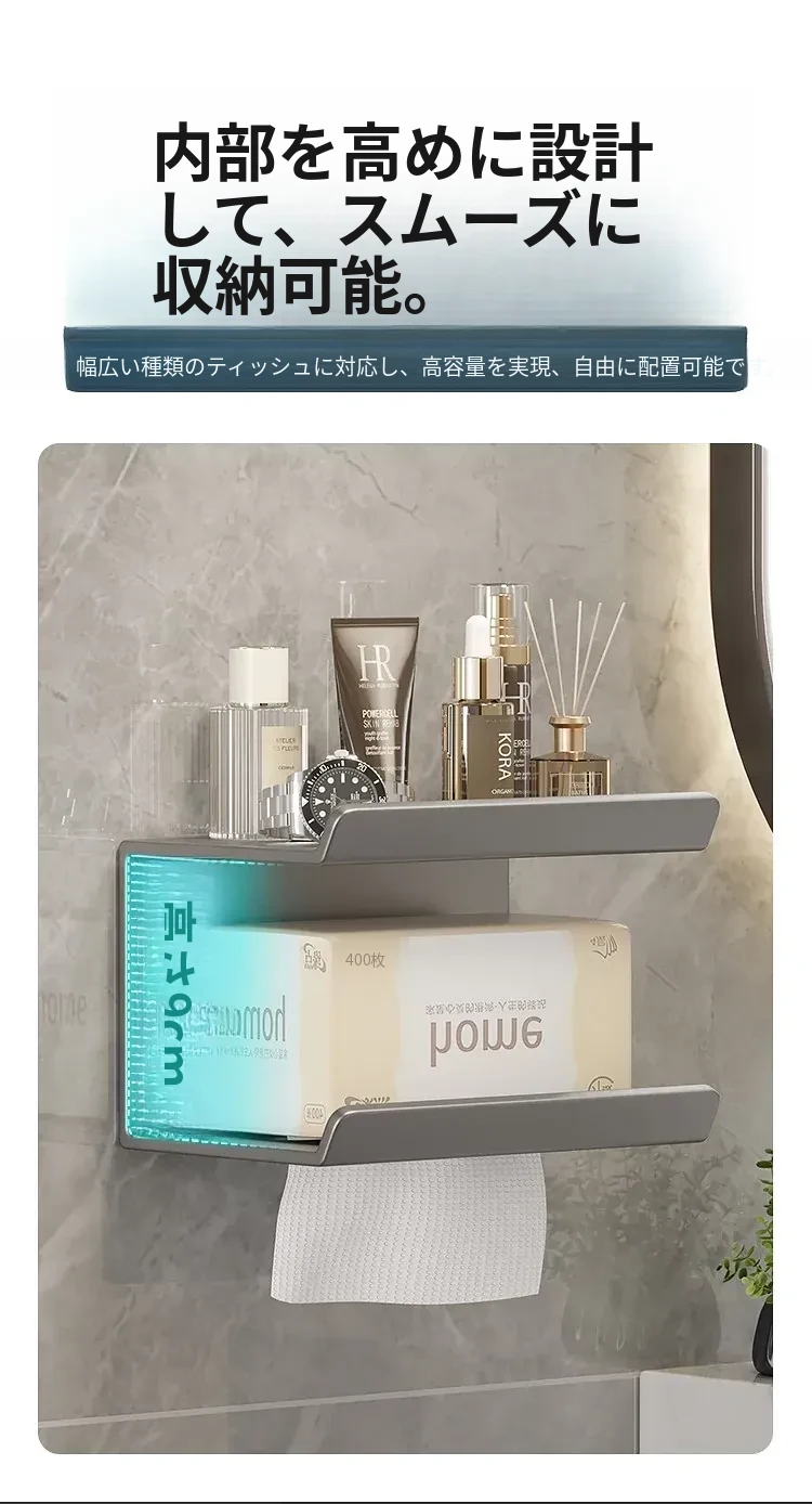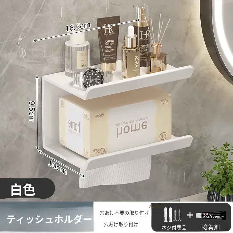 トイレ・バスルーム用壁掛けティッシュボックス|穴あけ不要で簡単取り付け|ティッシュ・トイレットペーパー収納ラック|スッキリ整理できるデザインでおしゃれ空間を演出!