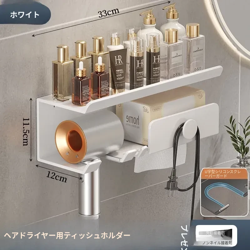 ヘアドライヤー用ティッシュホルダー - 穴あけ不要取り付け【ホワイト】