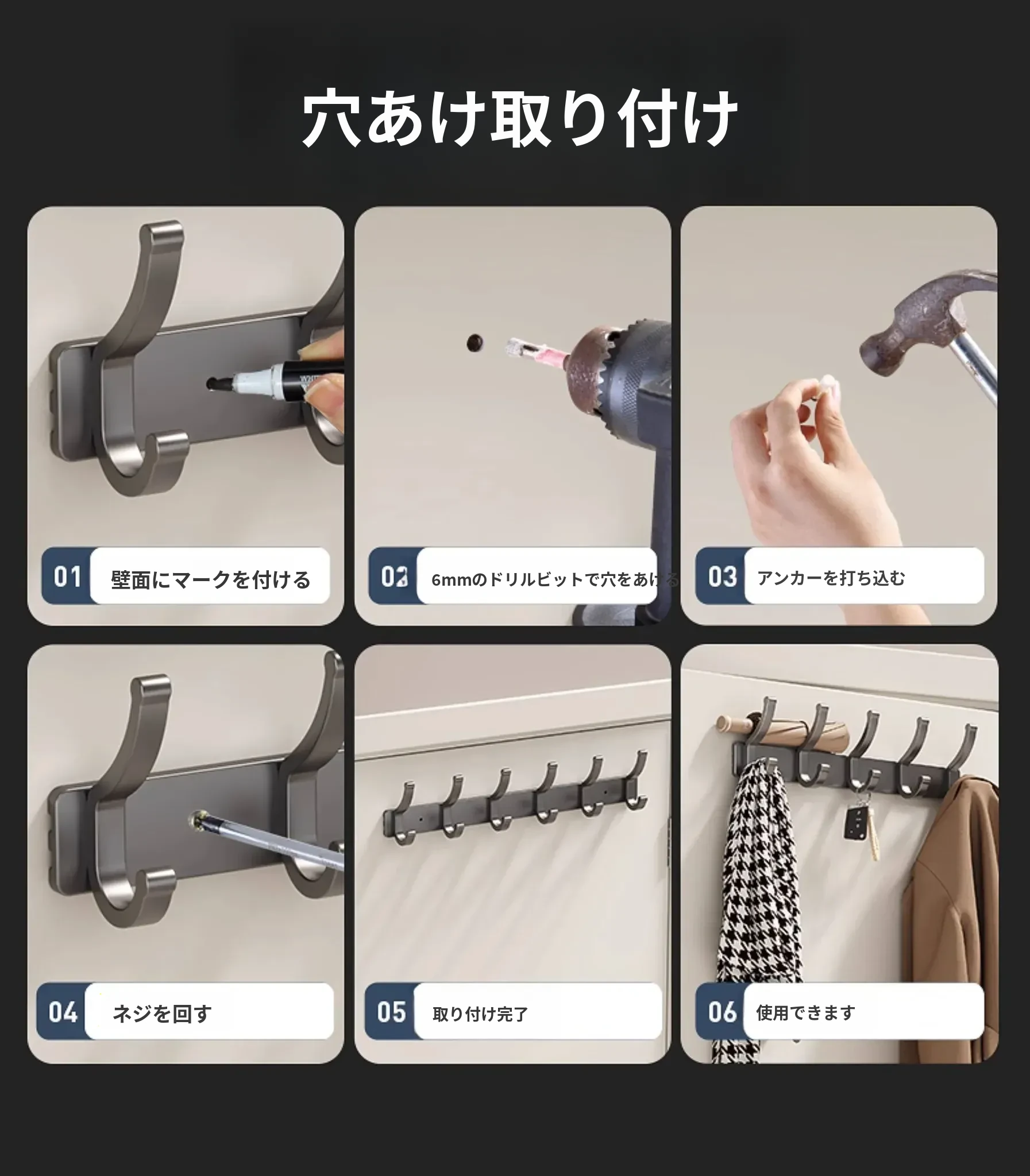 ダブルフックハンガーフック【ガンメタルグレー6フック】