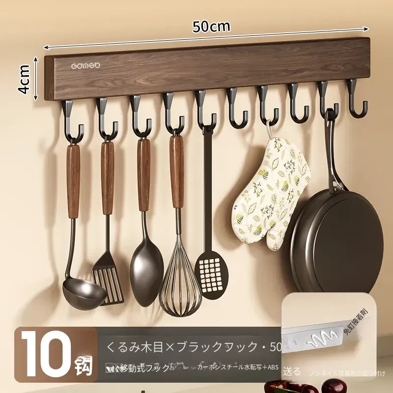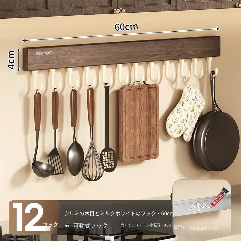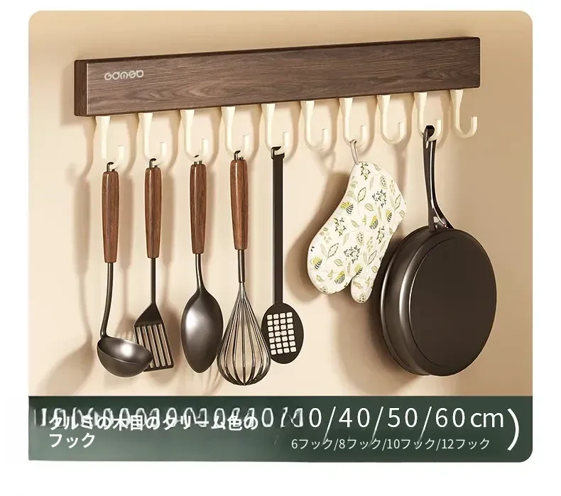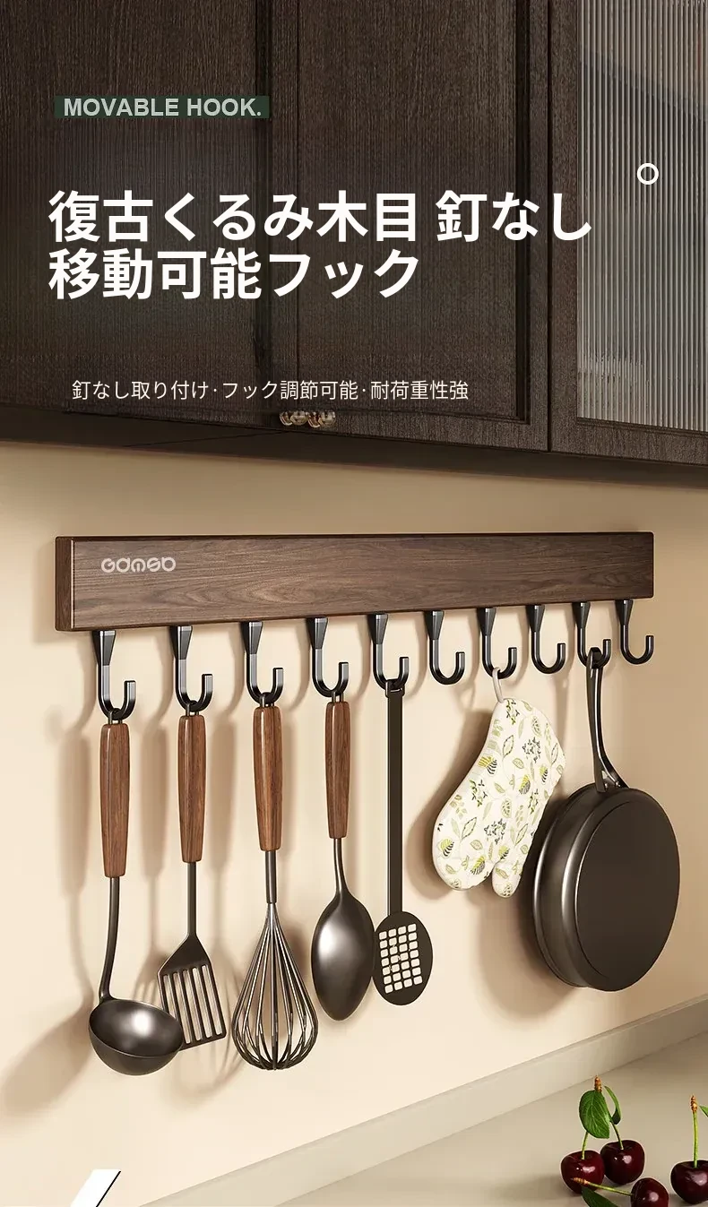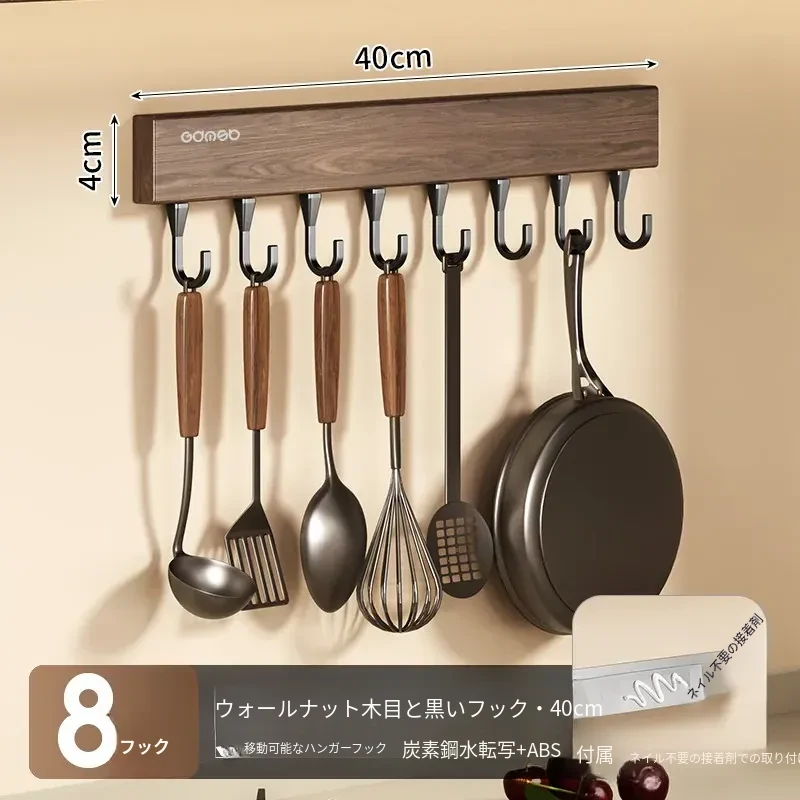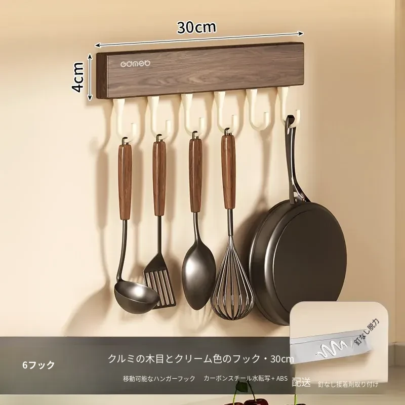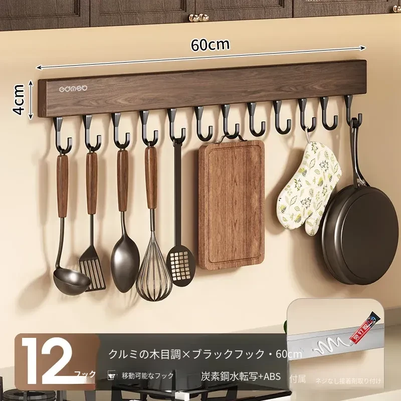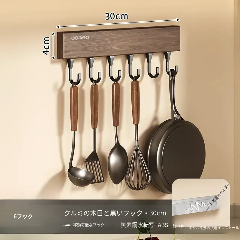 キッチン用フック ウォールマウント型の多機能収納ラック - ノーダリルで取り付け簡単、ウォールナット木目デザインの鍋やヘラをスマートに収納する便利アイテム!