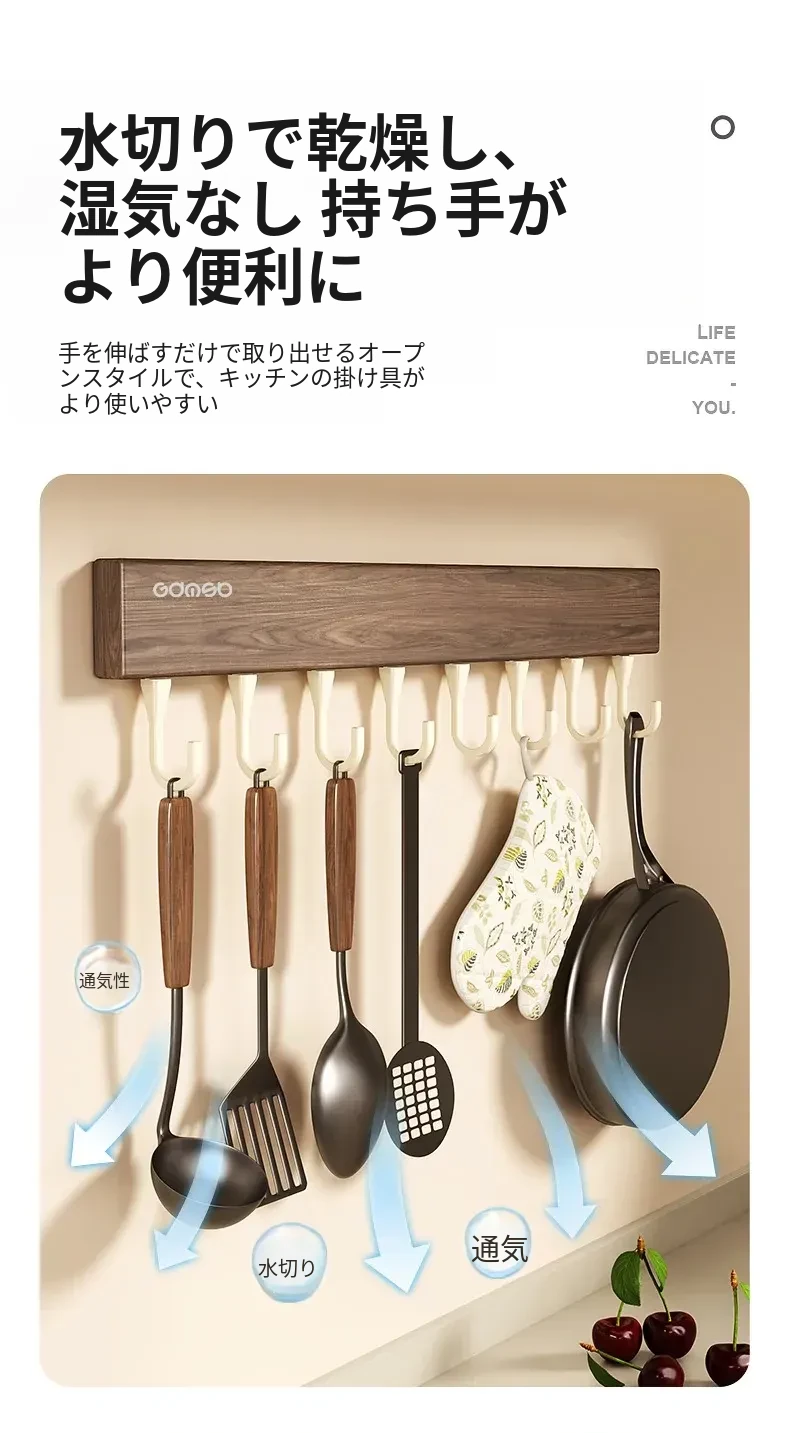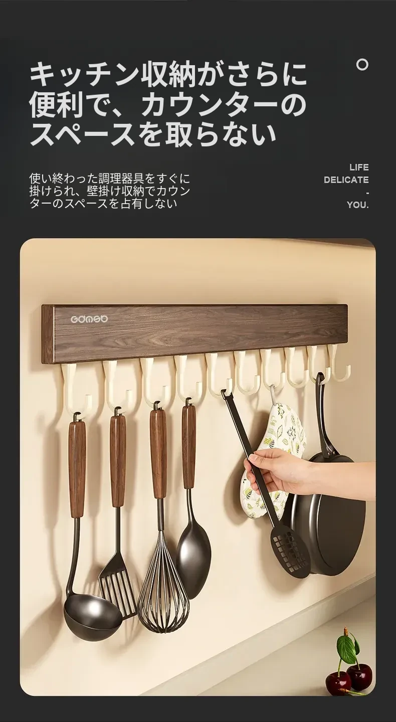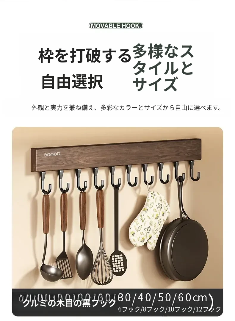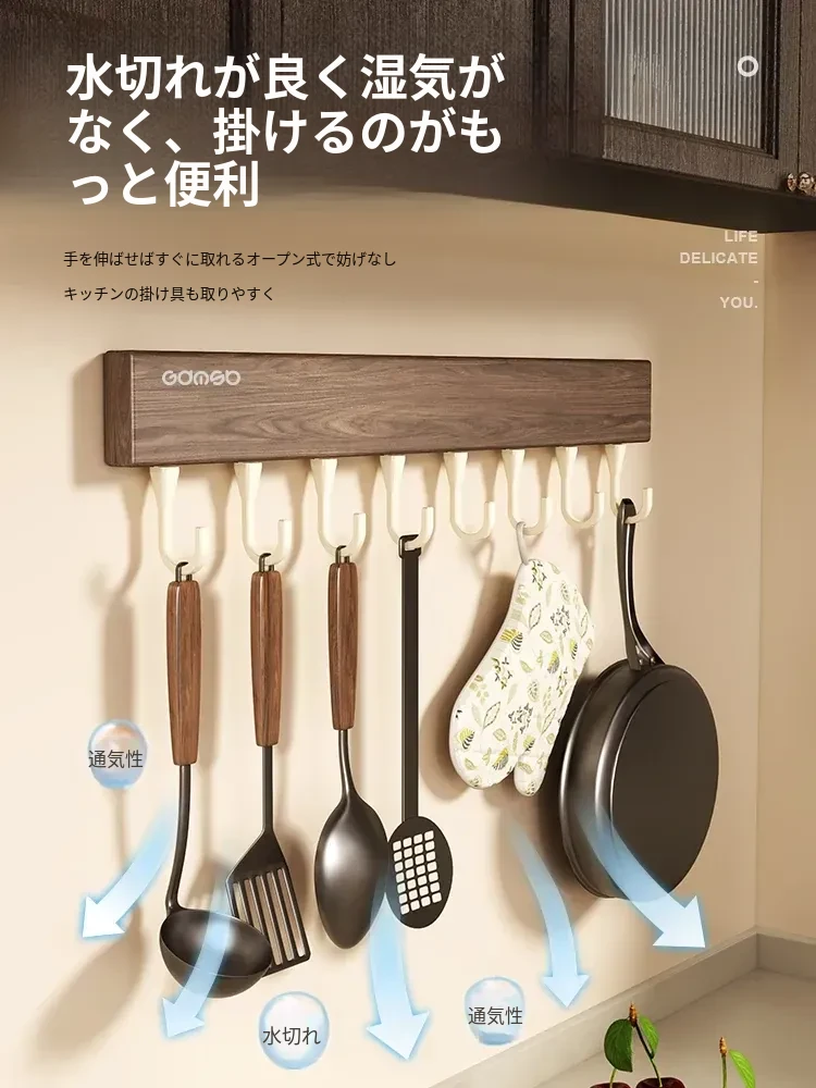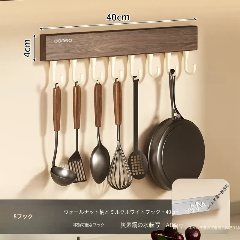 キッチン用フック ウォールマウント型の多機能収納ラック - ノーダリルで取り付け簡単、ウォールナット木目デザインの鍋やヘラをスマートに収納する便利アイテム!