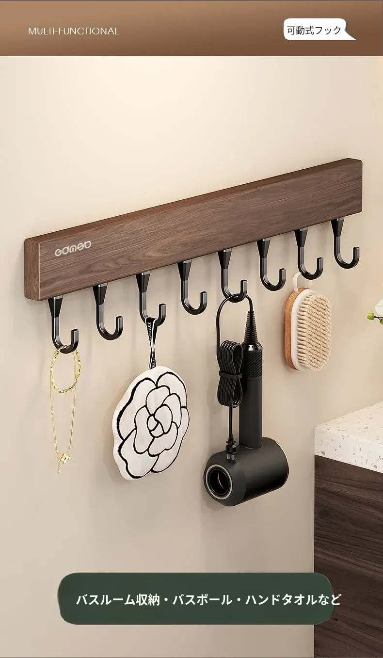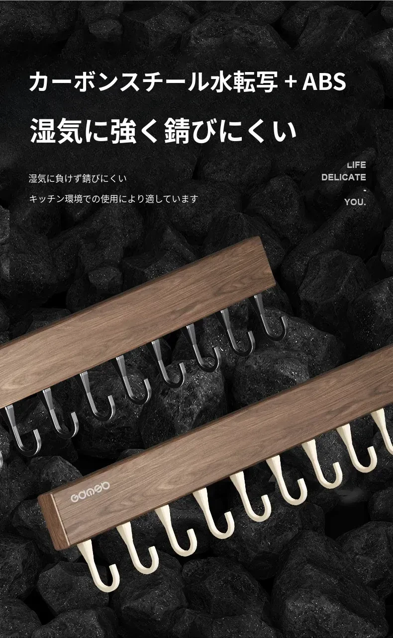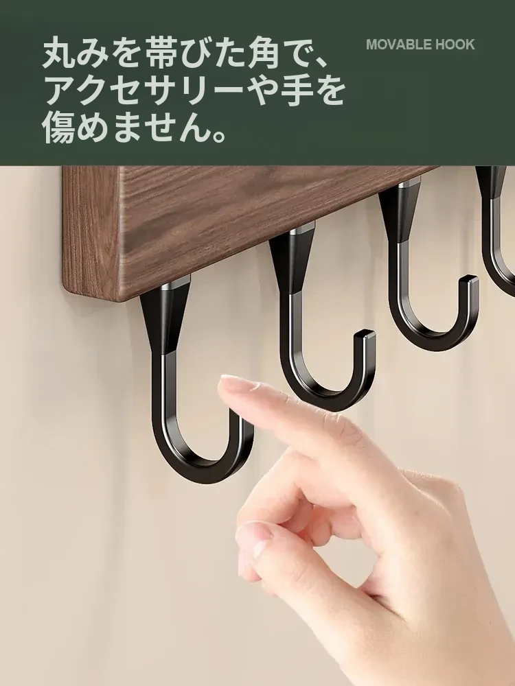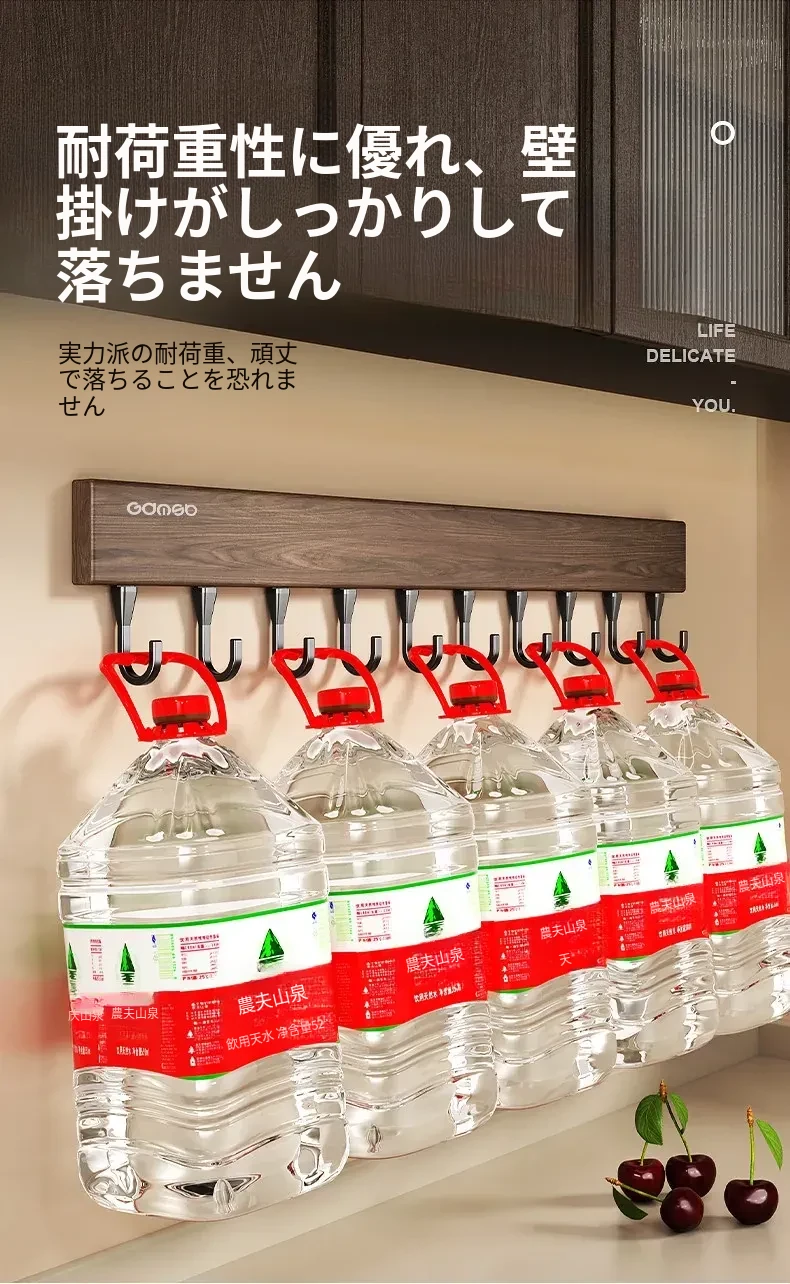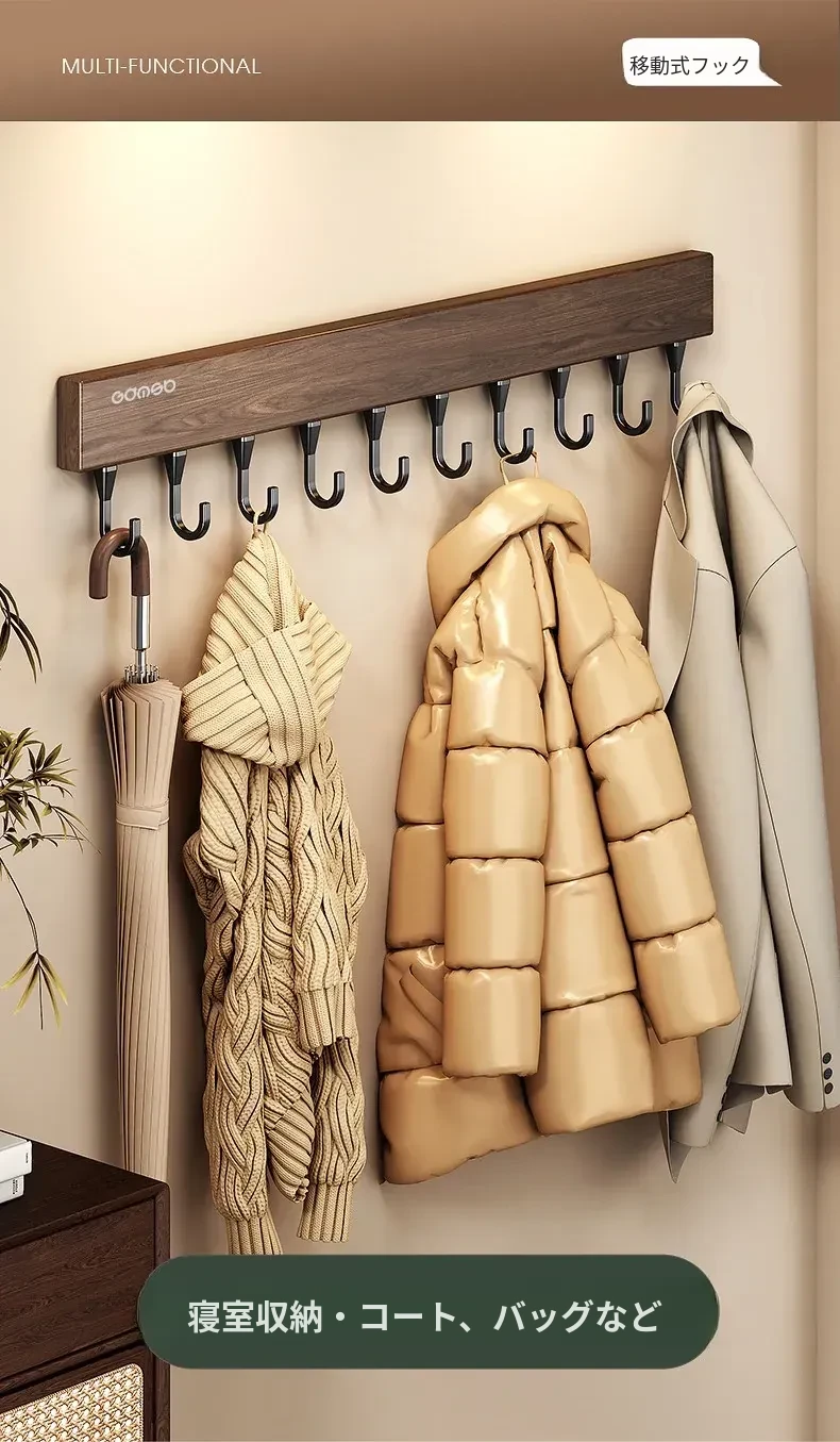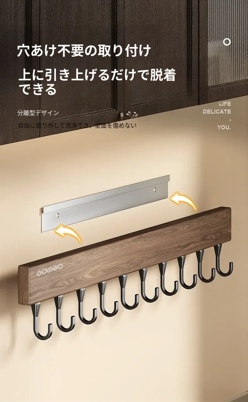 キッチン用フック ウォールマウント型の多機能収納ラック - ノーダリルで取り付け簡単、ウォールナット木目デザインの鍋やヘラをスマートに収納する便利アイテム!