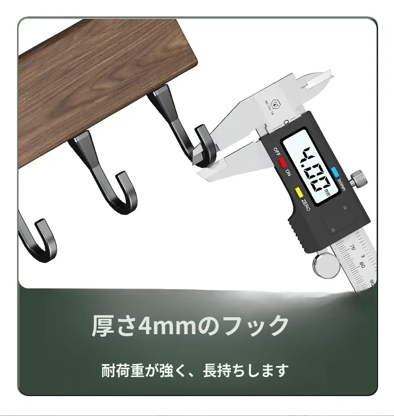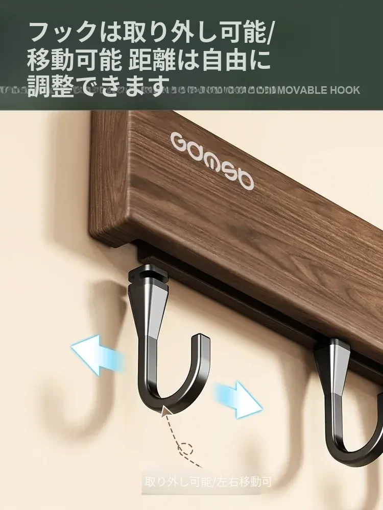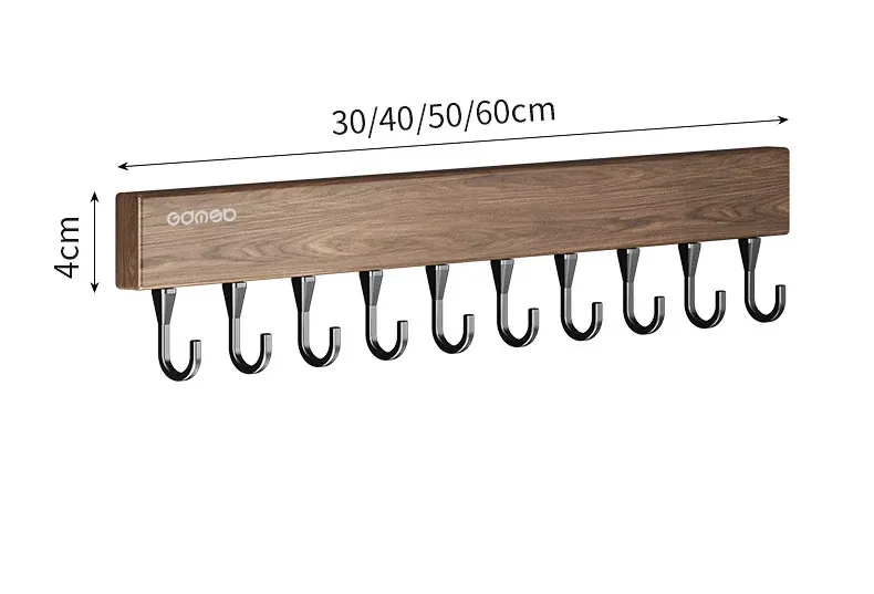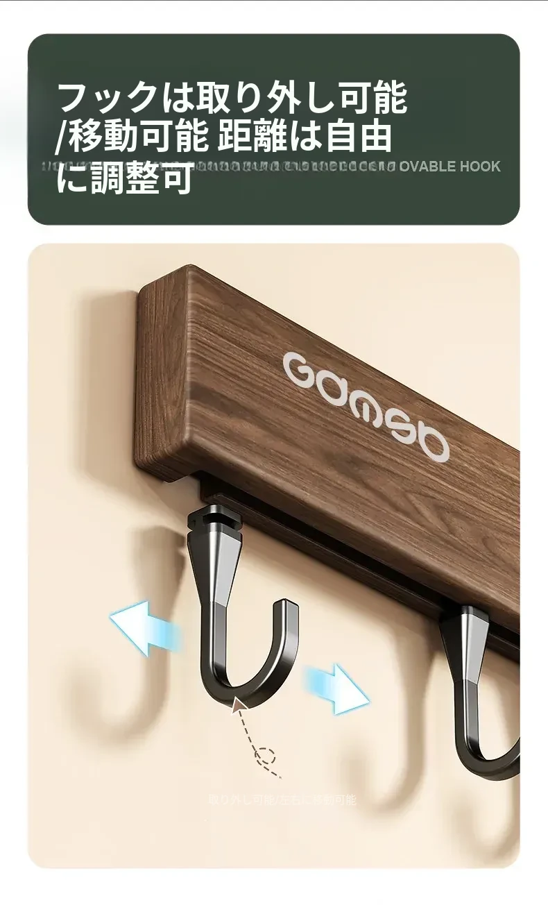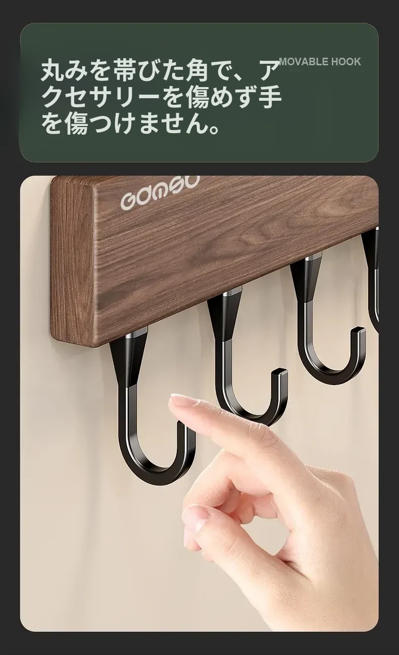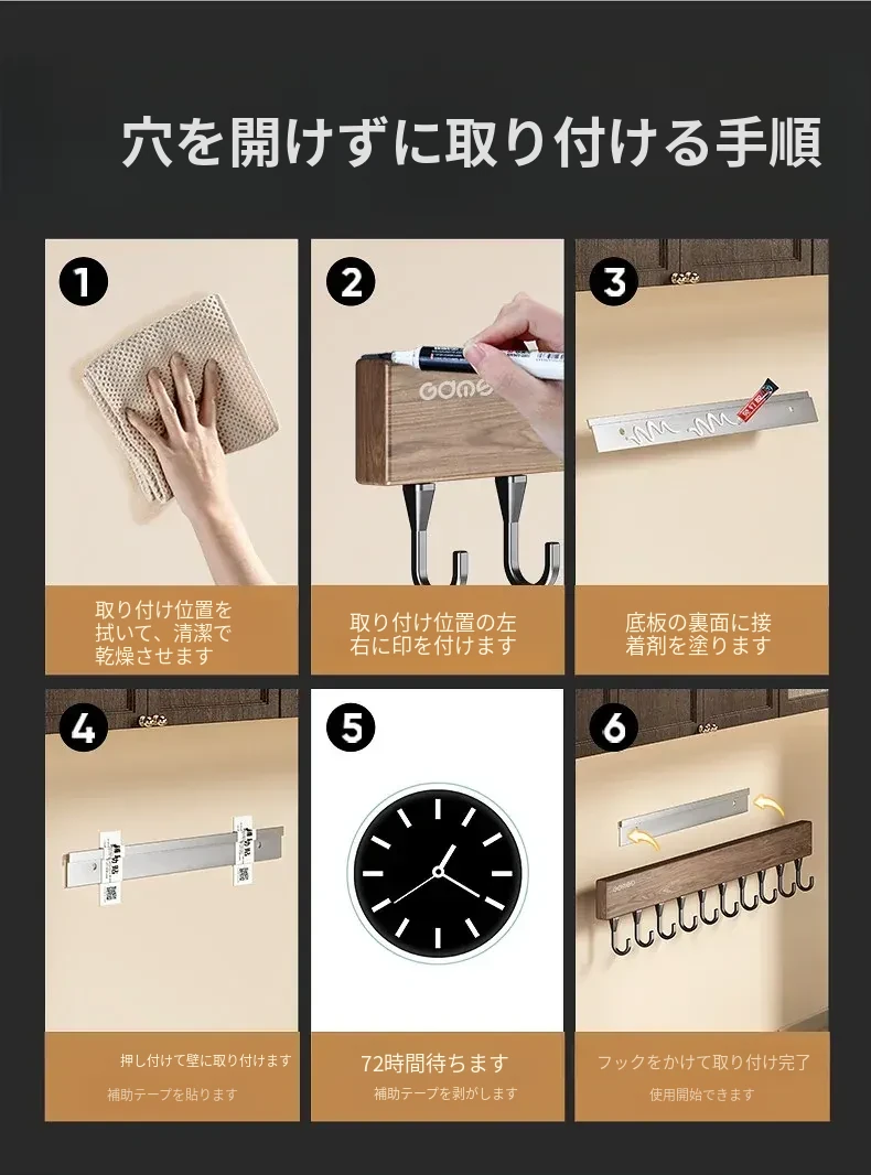 キッチン用フック ウォールマウント型の多機能収納ラック - ノーダリルで取り付け簡単、ウォールナット木目デザインの鍋やヘラをスマートに収納する便利アイテム!