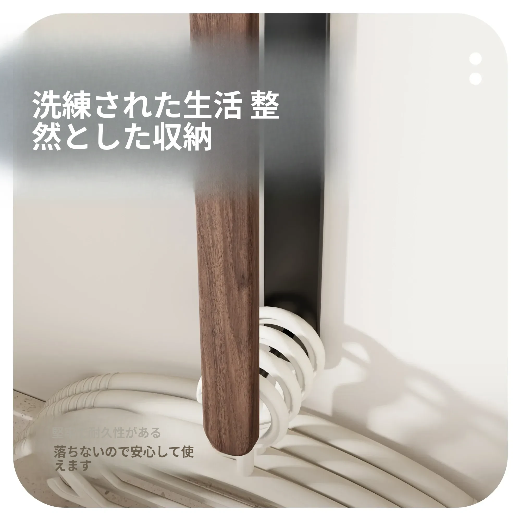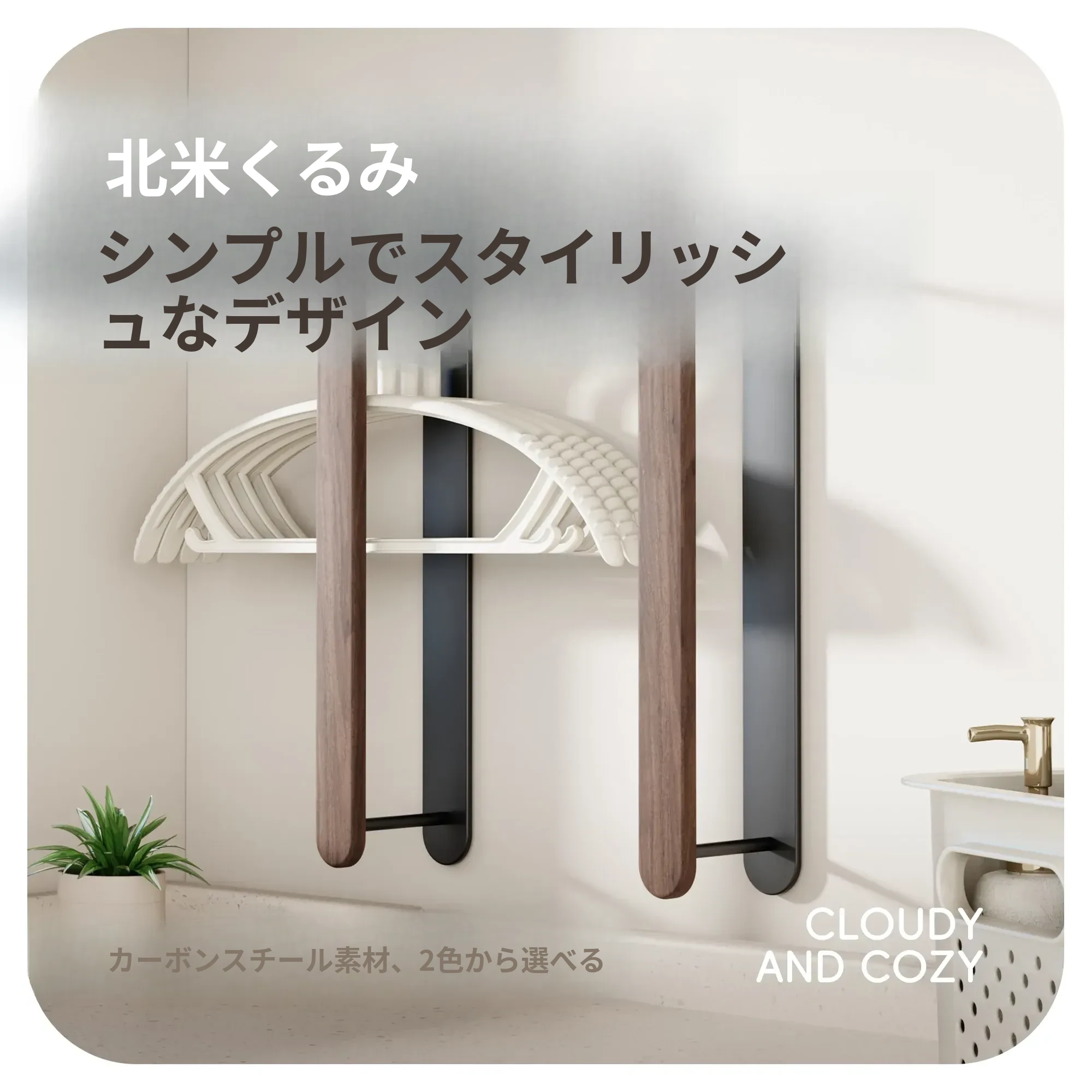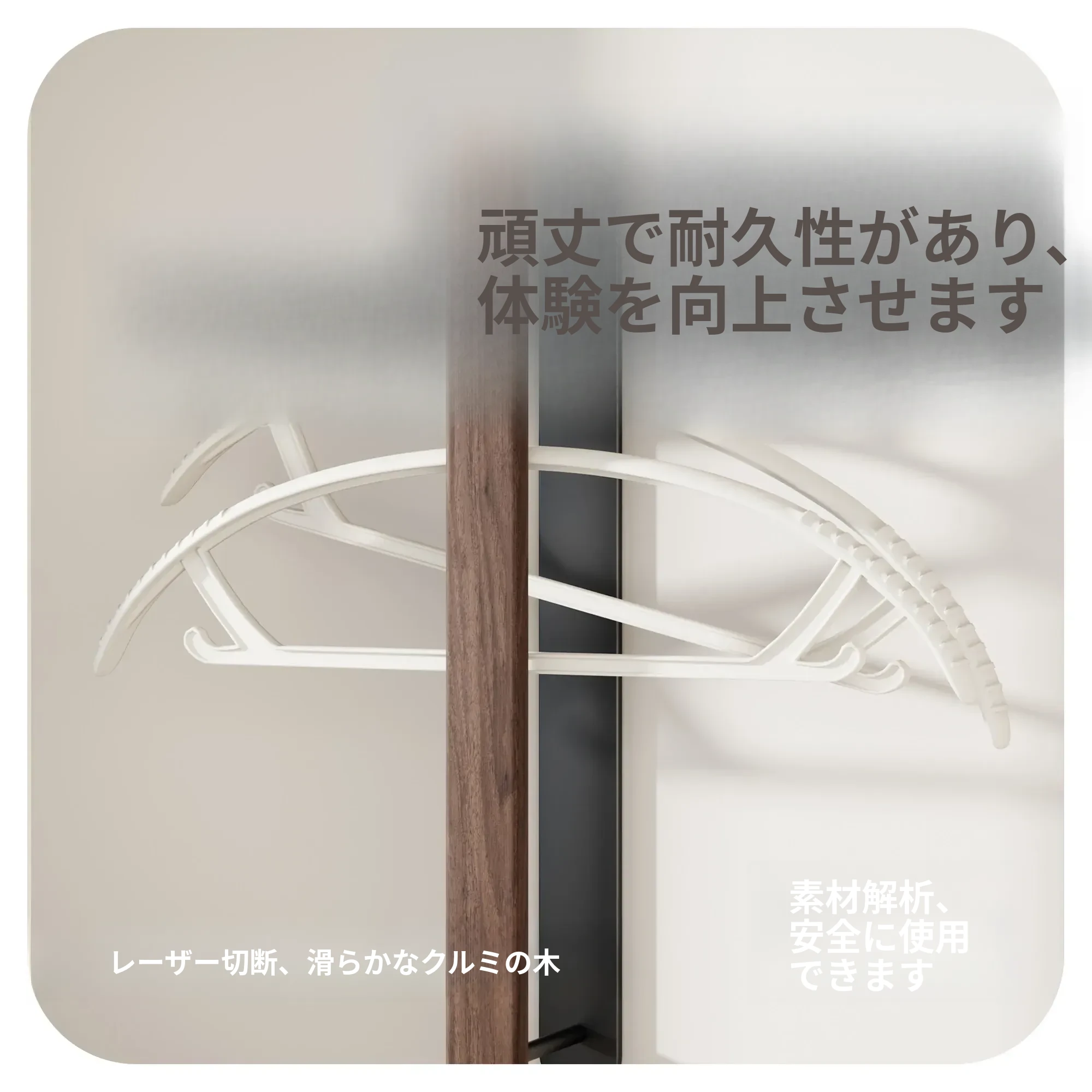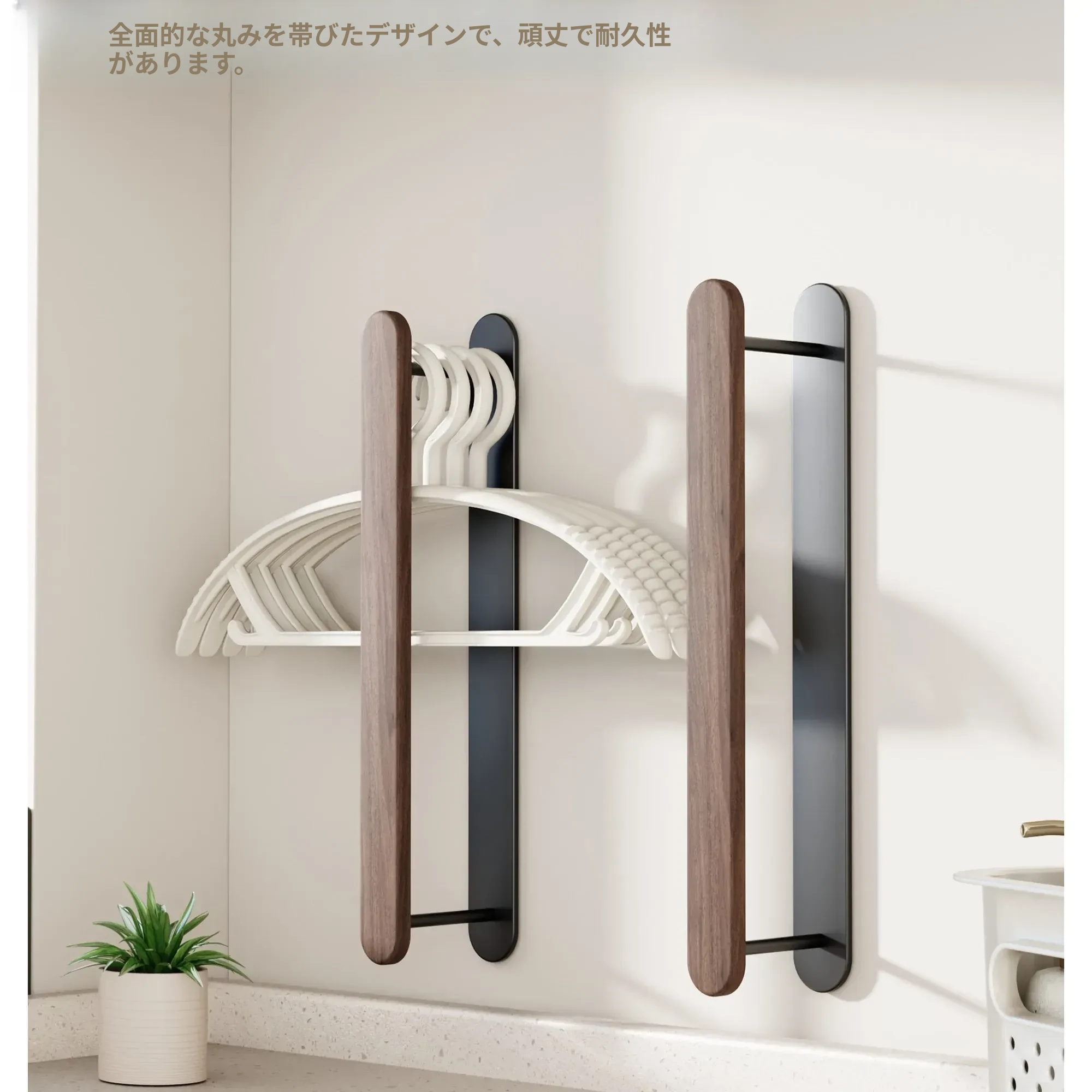 ウォールマウント式くるみ材ハンガー収納ラック - 穴あけ不要で、バルコニーや壁にピッタリ!おしゃれで実用的な衣類整理の必需品。家のスペースを有効活用!