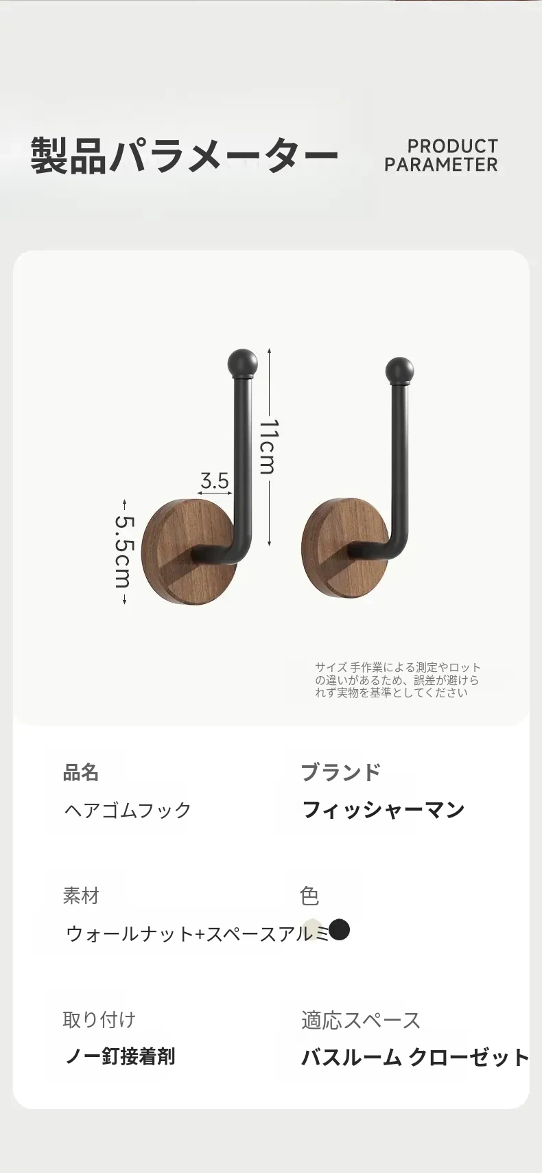 黒-ウォールナット【ヘアゴムフック2個入り】