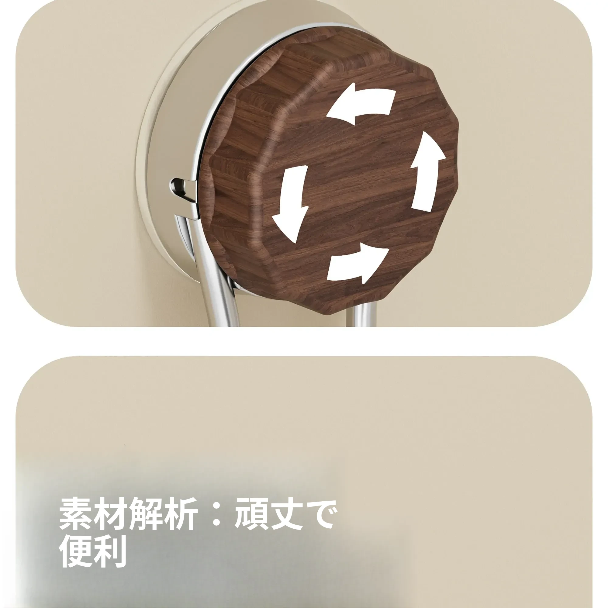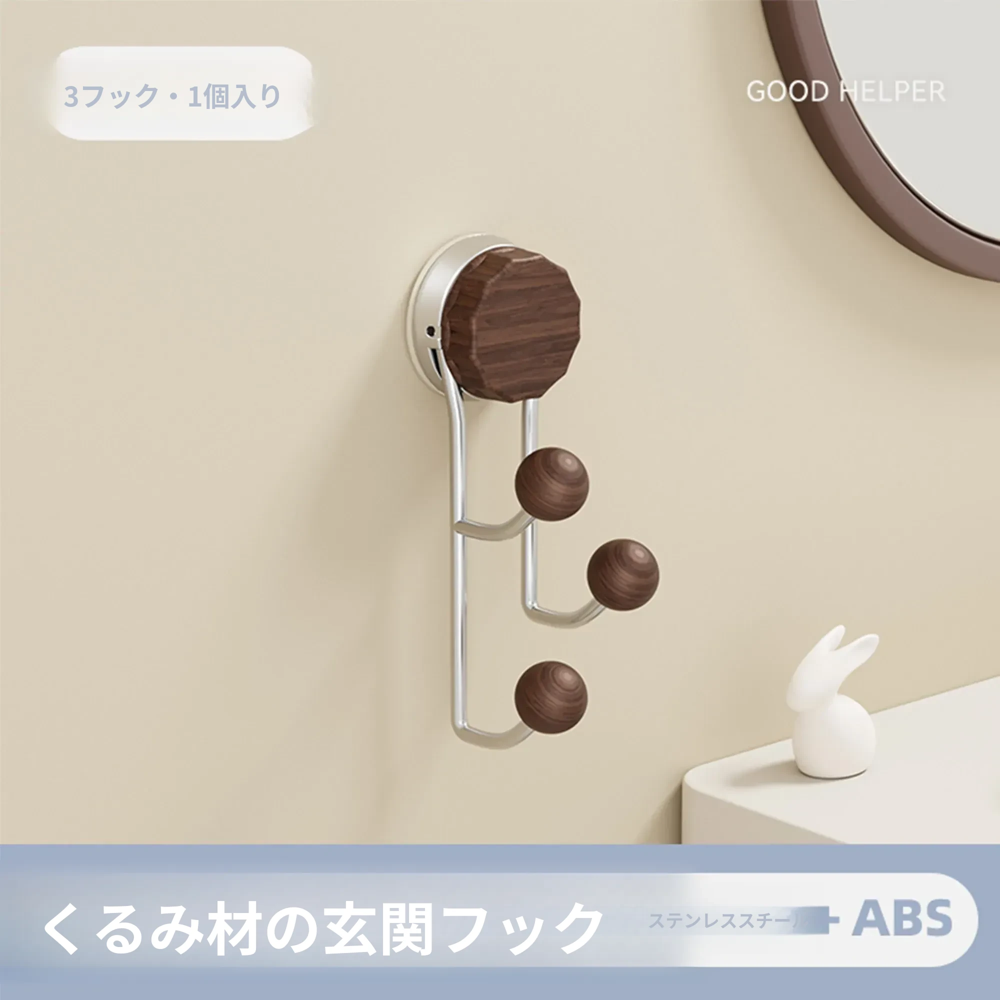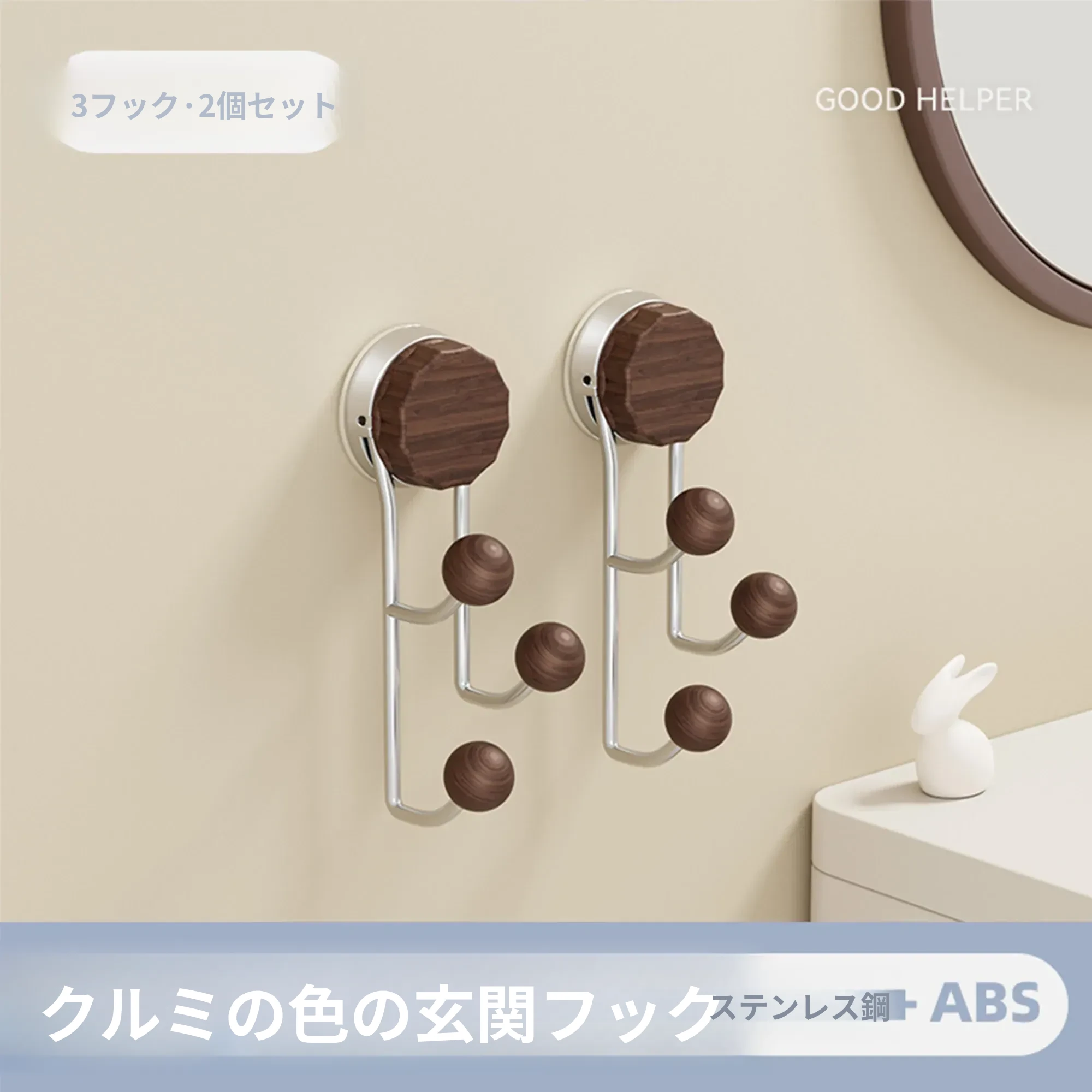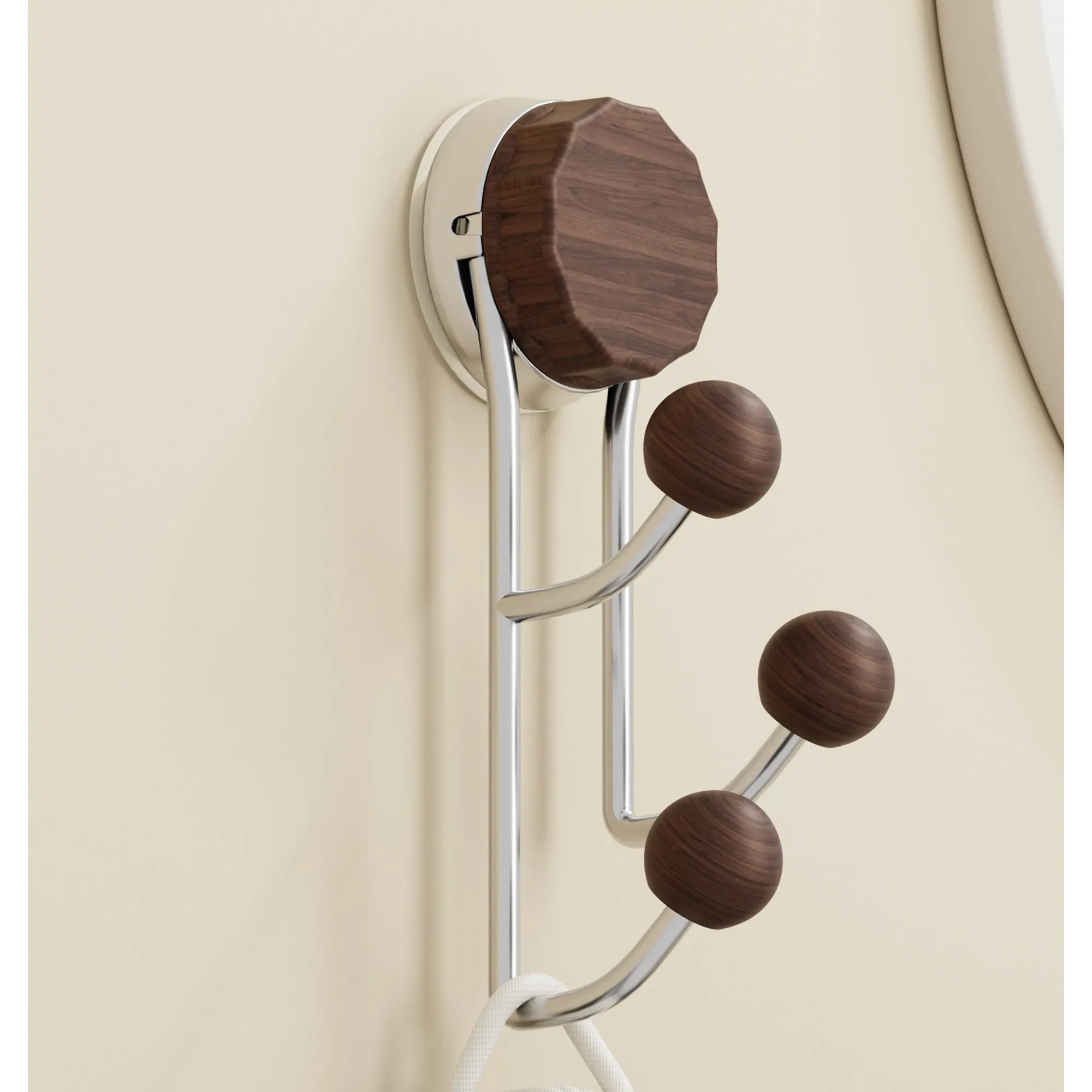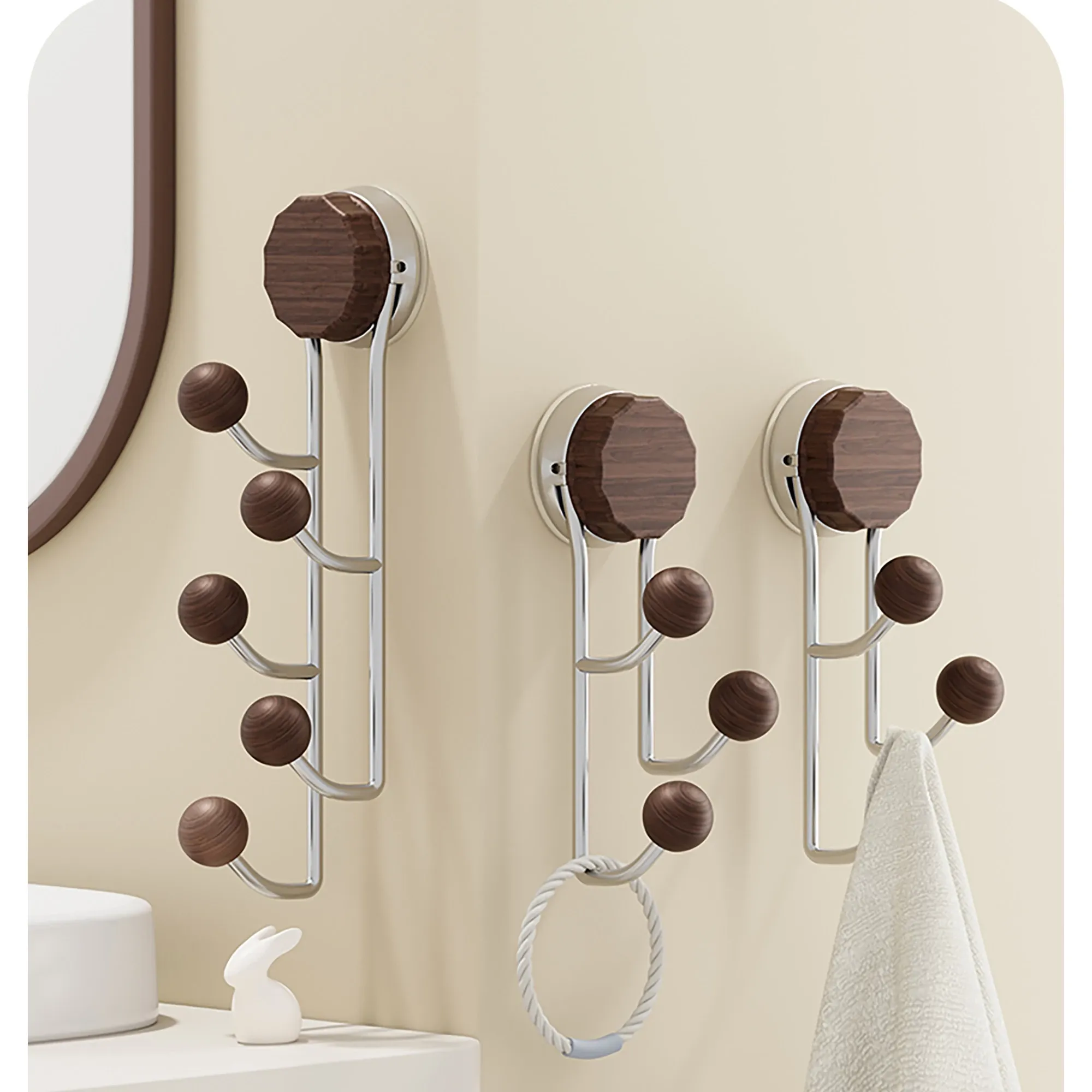 強力接着剤で簡単取り付け!胡桃木製吸盤フック - 穴を開けずに使えるおしゃれな衣類掛け。バスルームや玄関、ドアの裏に最適な粘着フック!おしゃれで便利、すっきりとした空間を実現します。