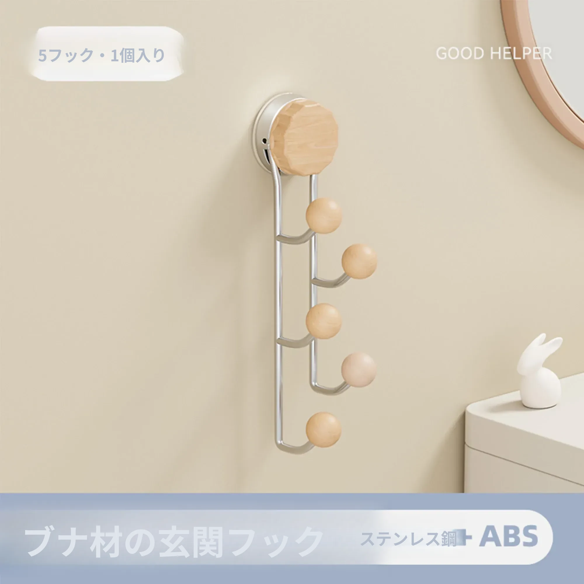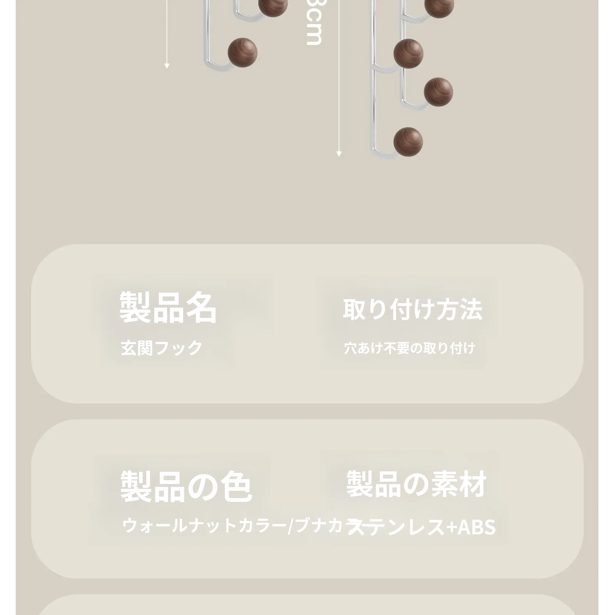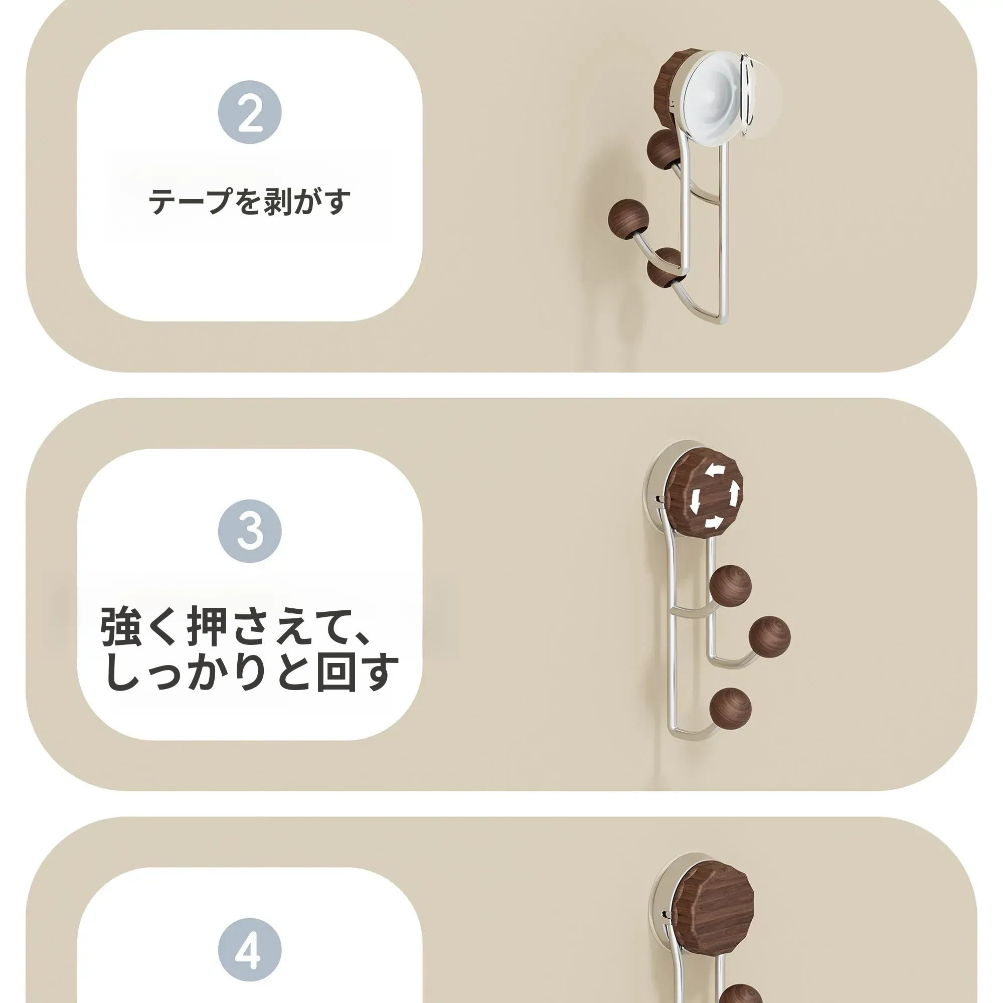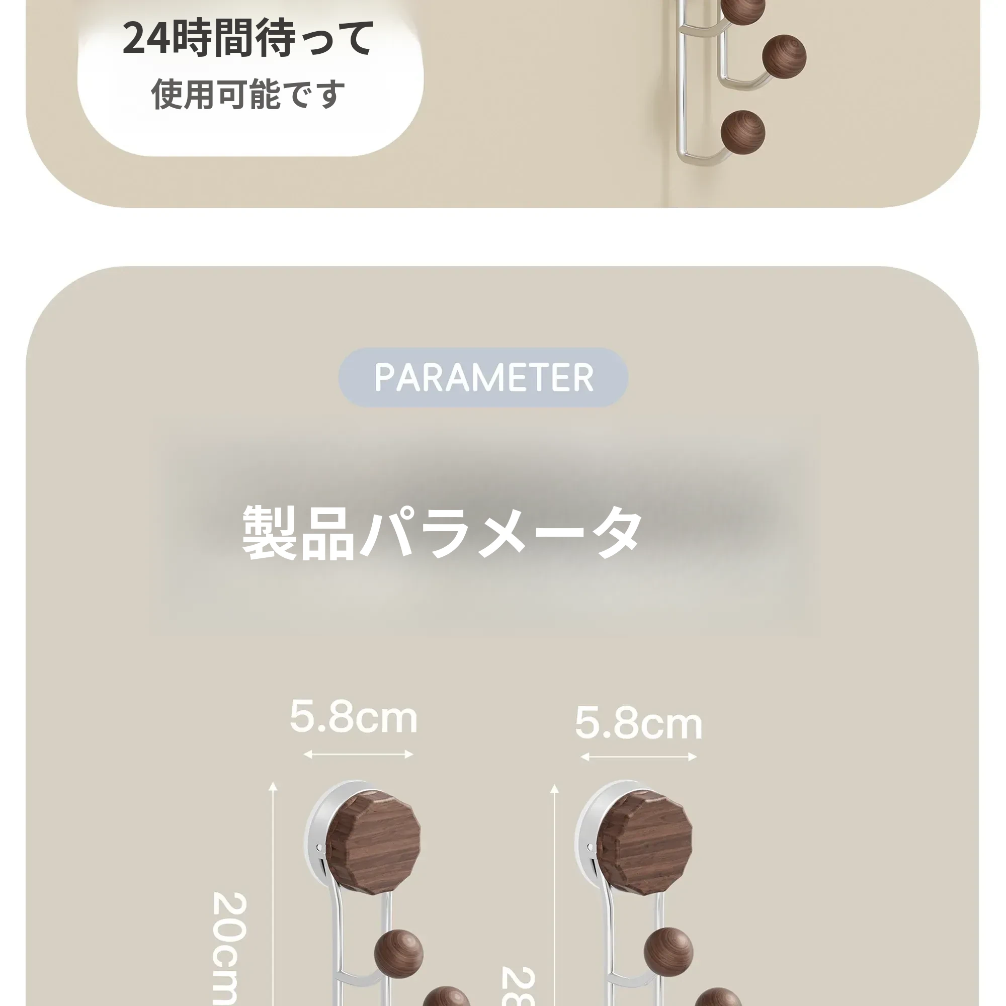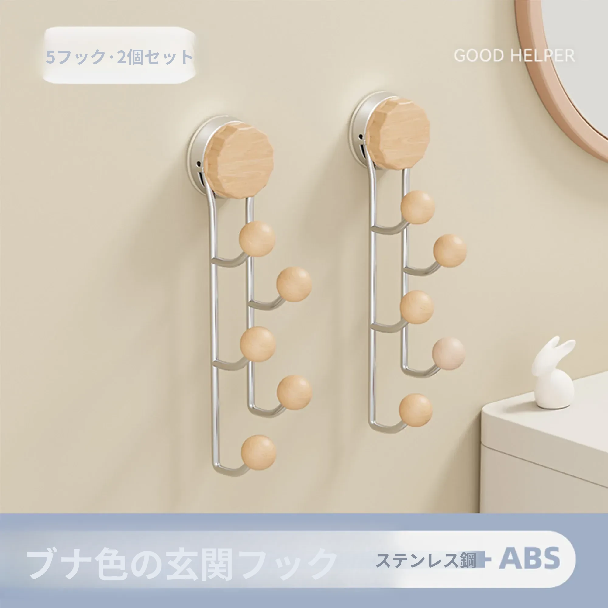 強力接着剤で簡単取り付け!胡桃木製吸盤フック - 穴を開けずに使えるおしゃれな衣類掛け。バスルームや玄関、ドアの裏に最適な粘着フック!おしゃれで便利、すっきりとした空間を実現します。