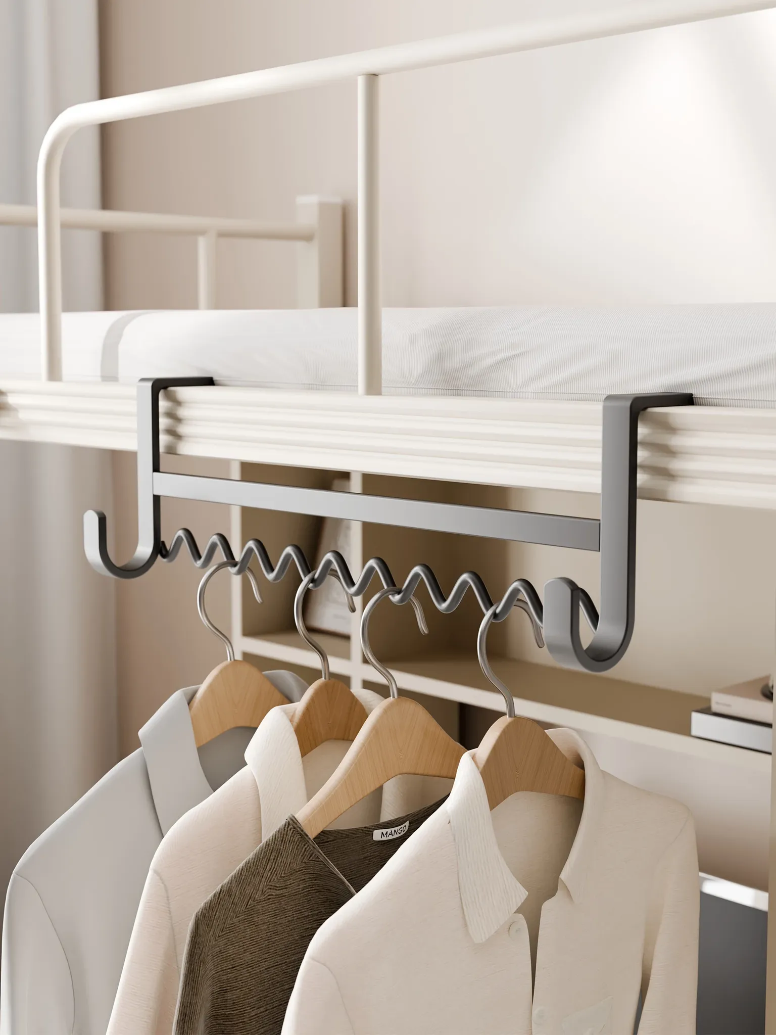寮生活を便利にする!波形デザインのベッドサイド衣類ハンガー、上下二段ベッド対応収納フック付き!おしゃれで実用的な収納ラックで、部屋をすっきり整理!