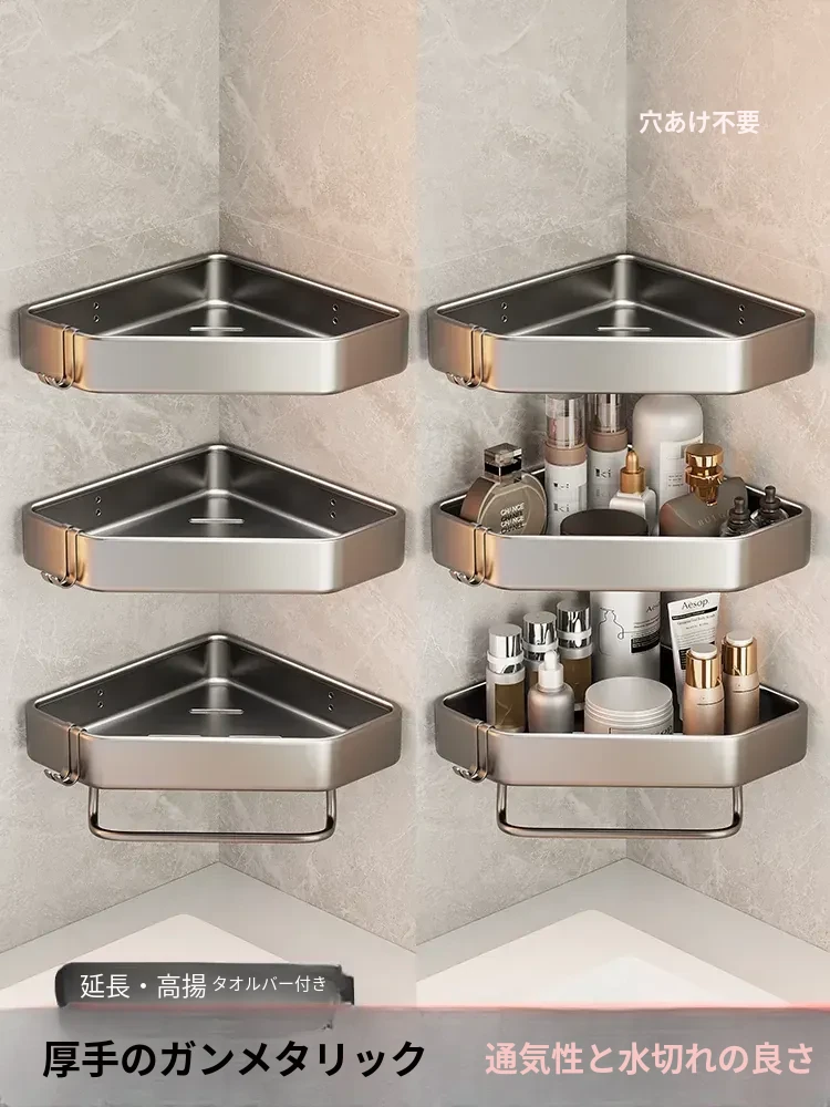 バスルーム三角壁掛け収納棚 - シャワー室やトイレに最適な角置きラック!壁に穴を開けずに簡単取り付け、スペースを有効活用してスッキリ整理!
